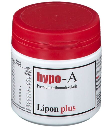 Nahrungsergänzungsmittel sind kein Ersatz für eine ausgewogene, abwechslungsreiche Ernährung und eine gesunde Lebensweise.hypo-A Lipon PlusZutaten: Hefepulver, Hydroxypropylmethylcellulose, alpha-Liponsäure 18,1 %, Nicotinamid 6,4 %, D-Biotin 3,0 %, Thiaminhydrochlorid 0,82 %, Phytomenadion 0,32 %, Chrom-III-chlorid 0,04 %, InulinNährwerte:Durchschnittlicher Gehaltpro Kapsel% des empf. Tagesbedarfs*pro 100 gEnergie6,78 kJ(1,6 kcal) 1226,0 kJ(289,3kcal)Fett7,94 mg 1,436 gKohlenhydrate169,2 mg 30,597 gEiweiß218,2 mg 39,458 gSalz0 mg 0 galpha-Liponsäure100 mg 18,033 gNiacin (NE)32 mg2005,787 gVitamin B13,3 mg3000,597 gBiotin150 µg3000,027 gVitamin K180 µg1070,014 gChrom40 µg1000,0072 g* Referenzmenge nach EU-Richtlinie VO 1169/2011 EUVerzehrsempfehlung:1 Kapsel täglichHinweis:Die angegebene empfohlene Tagesmenge darf nicht überschritten werden.Aufbewahrung: Kühl (6-25 °C) und lichtgeschützt lagern. Außerhalb der Reichweite von kleinen Kindern aufbewahren.Nettofüllmenge:100 Kapseln à 553 mg = 55,3 gHerstellerdaten: hypo-A GmbHKücknitzer Hauptstr. 5323569 Lübeck ...