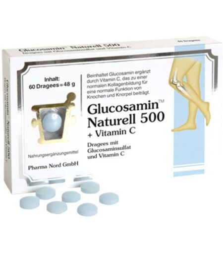 Nahrungsergänzungsmittel sind kein Ersatz für eine ausgewogene und abwechslungsreiche Ernährung und eine gesunde Lebensweise.Die tägliche Belastung der Gelenke kann mit der Zeit zu Verschleißerscheinungen führen. Achten Sie daher ein Leben lang auf Ihre Gelenke! Jedes Glucosamin-Dragee enthält 500 mg Glucosaminsulfat, das zur Erhaltung der gesunden Gelenkfunktion beitragen kann. Glucosamin kommt im menschlichen Körper in natürlicher Form als Schlüsselbaustein der Knorpelmasse vor.Was ist Glucosamin Naturell 500?Neben Vitamin C, das zur Aufrechterhaltung normaler Kollagenbildung beiträgt, enthält Glucosamin Naturell 500 Glucosaminsulfat. Glucosamin kommt in natürlicher Form im Knorpelgewebe unserer Gelenke vor. Der Zusatz “sulfat” bedeutet lediglich, dass das Glucosamin eine natürliche Schwefelquelle enthält.Woher kommt Glucosamin?Es gibt keine Nahrungsmittel, in denen Glucosamin in fertig verfügbarer Form vorliegt. Glucosamin kann am besten durch Einnahmeeines Nahrungsergänzungsmittels aufgenommen werden. Das in Glucosamin Naturell 500 enthaltene Glucosamin wird aus Wildgarnelen gewonnen, die in ihrem natürlichen Lebensraum gefangen werden - nicht aus Zuchtgarnelen.Wie kann Ihnen Glucosamin Naturell 500 helfen?Die tägliche Einnahme von Glucosamin Naturell 500 ist eine gute Möglichkeit, Ihre Gelenke mit einigen der Stoffe zu versorgen, die in normalem Knorpelgewebe vorkommen. Das darin enthaltene Vitamin C unterstützt Ihren Körper und die biologischen Prozesse, die zurBeweglichkeit Ihrer Gelenke beitragen.Zutaten: Krebstierextrakt mit Gehalt an Glucosaminsulfat, Füllstoff mikrokristalline Cellulose, Stabilisator Polyvinylpyrrolidon, L-Ascorbinsäure,Trennmittel Siliciumdioxid, Überzugsmittel Hydroxypropylmethylcellulose, Überzugsmittel Magnesiumstearat, Trennmittel Talkum, Farbstoff Titaniumdioxid, Farbstoff Indigocarmin.Nährwerte;Durchschnittliche Nährwerte:pro Dragee2 Dragees enthalten%NRV* Energie 7,1 kJ Eiweiß 150 mg Kohlenhydrate 245 mg Fett 10 mg Glucosaminsulfat (entspricht 1000 mg Glucosaminsulfat/2 KCl)400 mg 800 mg-Vitamin C20 mg 40 mg50 %*Empfohlene TagesdosisVerzehrsempfehlung:Pro Tag 2 Dragees zu beliebigen Mahlzeiten mit etwas Flüssigkeit verzehren. Die angegebene empfohlene Tagesdosis darf nicht überschritten werden.Nicht zum Verzehr geeignet bei Fisch- oder MeeresfrüchteallergieHinweis:Die angegebene Tagesverzehrmenge darf nicht überschritten werden.Aufbewahrung: Kühl (6-25 °C) und lichtgeschützt lagern. Nach dem Öffnen innerhalb von 3 Monaten aufbrauchen.Nettofüllmenge:60 Dragees = 48 gHerstelledaten:Pharma Nord GmbHSchiffbrückstraße 624937 Flensburg ...