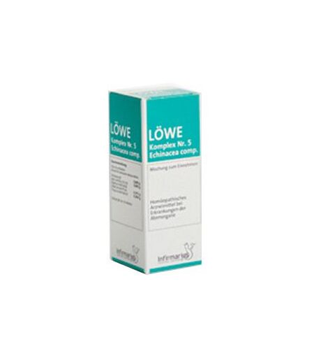 Homöopathisches Arzneimittel bei Erkrankungen der Atemorgane. Zusammensetzung: 10,0 ml enthalten (arzneilich wirksame Bestandteile): Echinacea 0,898 g, Apis mellifica Dil. D4 0,890 g, Baptisia (HAB 34) Ø (HAB, Vorschrift 3a) 0,915 g, Thuja occidentalis Ø 0,454 g Sonstige Bestandteile: Ethanol 94 % (m/m), gereinigtes Wasser. Dosierungsanleitung, Art und Dauer der Anwendung: Soweit nicht anders verordnet: Bei akuten Zuständen sollten Erwachsene und Jugendliche ab 12 Jahren alle halbe bis ganze Stunde, höchstens 6-mal täglich, je 5 Tropfen einnehmen. Eine über eine Woche hinausgehende Anwendung sollte nur nach Rücksprache mit einem homöopathisch erfahrenen Therapeuten erfolgen. Bei chronischen Verlaufsformen 1- bis 3-mal täglich je 5 Tropfen einnehmen. Bei Besserung der Beschwerden ist die Häufigkeit der Einnahme zu reduzieren. Kleinkinder von 2 Jahren bis zu 6 Jahren erhalten nicht mehr als die Hälfte. Kinder zwischen dem 6. und 12. Lebensjahr nicht mehr als zwei Drittel der Erwachsenendosis. Es wird empfohlen, das Arzneimittel bei Kindern mit Wasser verdünnt anzuwenden. Wie lange sollten Sie LÖWE-Komplex Nr. 5 Echinacea comp. anwenden? LÖWE-Komplex Nr. 5 Echinacea comp. sollte ohne ärztlichen Rat nicht länger als 10 Tagen angewendet werden. ...