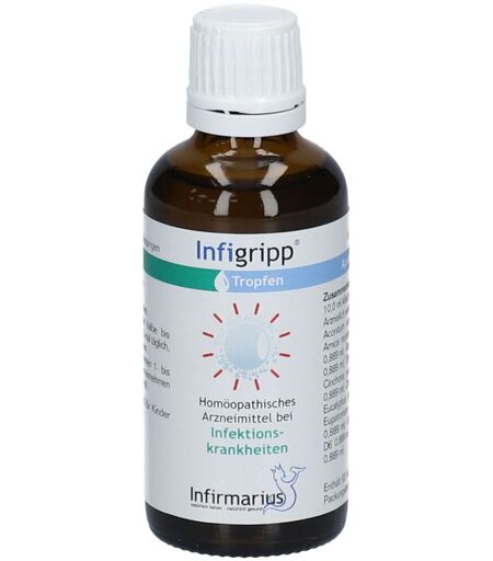 Infigripp Tropfen Homöopathisches Arzneimittel bei Infektionskrankheiten. Die Anwendungsgebiete leiten sich von den homöopathischen Arzneimittelbildern ab. Dazu gehören grippeähnliche fieberhafte Erkrankungen. Zusammensetzung: 10,0 ml enthalten:Aconitum napellus (Eisenhut/Sturmhut) Dil. D4 0,889 ml; Arnica montana ex planta tota Dil. D4 0,889 ml; Atropa bella-donna (Tollkirsche) Dil. D4 0,889 ml; Bryonia (Zaunrübe) Dil. D3 0,889 ml; Cinchona pubescens (China) (Chinarinde) Dil. D4 0,889 ml; Drosera (Sonnentau) Dil.D3 0,889 ml; Eucalyptus globulus (blauer Eukalyptus) Ø = D1 2,000 ml; Eupatorium perfoliatum (Wasserdost) Dil. D3 0,889 ml; Gelsemium sempervirens (wilder Jasmin) Dil. D6 0,889 ml; Polygala senega (Klapperschlangenwurz) Dil. D3 0,889 ml. Enthält 53 Vol.-% Alkohol Anwendung: Akute Zustände: Alle halbe bis ganze Stunde, höchstens 12-mal täglich, je 5 bis 10 Tropfen einnehmen. Chronische Verlaufsformen: 1- bis 3-mal täglich 5 bis 10 Tropfen einnehmen (25 Tropfen entsprechen 1 ml). Tropfen unverdünnt oder mit etwas Flüssigkeit einnehmen. ...