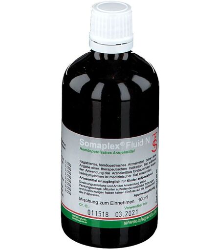Was ist Somaplex Fluid N und wofür wird es angewendet?Somaplex Fluid N ist ein registriertes homöopathisches Arzneimittel, daher ohne Angabe einer therapeutischen Indikation. Bei während der Anwendung des Arzneimittels fortdauernden Krankheitssymptomen ist medizinischer Rat einzuholen. Wie ist Somaplex Fluid N einzunehmen?Nehmen Sie Somaplex Fluid N immer genau nach der Anweisung in der Packungsbeilage ein. Bitte fragen Sie bei Ihrem Arzt oder Apotheker nach, wenn Sie sich nicht ganz sicher sind. Die folgenden Angaben gelten, soweit Ihnen der Arzt Somaplex Fuid N nicht anders verordnet hat. Bitte halten Sie sich an die Anwendungsvorschriften, da Somaplex Fluid N sonst nicht richtig wirken kann. Soweit nicht anders verordnet, Bei akuten Zuständen alle halbe bis ganze Stunde, höchtens 6x täglich, je 5 Tropfen einnehmen. Eine über eine Woche hinausgehende Anwendung sollte nur nach Rücksprache mit einen homöopathisch erfahrenen Therapeuten erfolgen. Bei chronischen Verlaufsformen 1 bis 3 mal täglich jeweils 5 Tropfen einnehmen. Bei Besserung der Beschwerden ist die Häufigkeit der Einnahme zu reduzieren. Die Tropfen können unverdünnt oder auf einem Teelöffel mit Wasser verdünnt eingenommen werden. Die Einnahme ist unabhängig von den Mahlzeiten. Was Somaplex-Fluid N enthält:Die Wirkstoffe sind:10 g (= 9,8 ml) enthalten an arzneilich wirksamen Bestandteilen: Amanita muscaria (HAB 34) Dil. D6 vinos (HAB, Vorschrift 3a) 0,125 g Atropa bella-donna Dil. D6 vinos 0,125 g Bryonia Dil. D6 vinos 0,125 g Lobelia inflata Dil. D6 vinos 0,125 g Clematis recta Dil. D6 vinos 0,125 g Chinchona pubescens Dil. D6 vinos 0,125 g Phosphorus Dil. D8 vinos 0,125 g Valeriana officibalis Dil. D6 vinos 0,125 gSonstiger Bestandteil: LikörweinEnthält: 16 Vol.-% Ethanol. ...