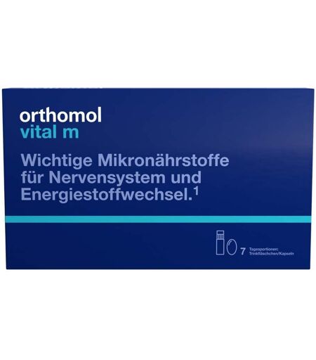 Nahrungsergänzungsmittel sind kein Ersatz für eine ausgewogene und abwechslungsreiche Ernährung und eine gesunde Lebensweise. Orthomol Vital m Orthomol Vital m ist eine umfassend formulierte Mikronährstoffkombination und enthält über 25 spezifische Nährstoffe. Mit Vitamin B12 und Magnesium zur Verringerung von Müdigkeit und Erschöpfung sowie als Beitrag zu einem normalen Energiestoffwechsel. Müdigkeit und Erschöpfung im Alltag Unser Alltag wird immer schnelllebiger. Phasen hoher Belastung reihen sich aneinander, egal ob beruflich oder privat. Das Resultat: Man fühlt sich müde und erschöpft. Gerade jetzt ist es umso wichtiger, auf eine ausgewogene Mikronährstoffversorgung zu achten. Orthomol Vital m ist ein Nahrungsergänzungsmittel. Es enthält wichtige Mikronährstoffe u. a. Vitamin B12 und Magnesium zur Verringerung von Müdigkeit und Erschöpfung sowie Omega-3-Fettsäuren. Orthomol Vital m Orthomol Vital m ist eine umfassend formulierte Mikronährstoffkombination und enthält über 25 spezifische Nährstoffe. Mit Vitamin B12 und Magnesium zur Verringerung von Müdigkeit und Erschöpfung sowie als Beitrag zu einem normalen Energiestoffwechsel. Müdigkeit und Erschöpfung im Alltag Unser Alltag wird immer schnelllebiger. Phasen hoher Belastung reihen sich aneinander, egal ob beruflich oder privat. Das Resultat: Man fühlt sich müde und erschöpft. Gerade jetzt ist es umso wichtiger, auf eine ausgewogene Mikronährstoffversorgung zu achten. Orthomol Vital m ist ein Nahrungsergänzungsmittel. Es enthält wichtige Mikronährstoffe u. a. Vitamin B12 und Magnesium zur Verringerung von Müdigkeit und Erschöpfung sowie Omega-3-Fettsäuren. Die Vital-Formel für mehr Energie Orthomol Vital m versorgt Dich jeden Tag mit wichtigen Mikronährstoffen. Hierzu gehört u. a. der gesamte Vitamin-B-Komplex inkl. 450 µg Vitamin B12 je Tagesportion. Es enthält Omega-3-Fettsäuren sowie weitere Vitamine und Mineralstoffe. Bei Müdigkeit und Erschöpfung. Für mehr Energie im Alltag.1 B-Vitamine – komplex und wichtig für die Nerven Vitamin B, vor allem Vitamin B12, gilt als Nahrung“ für die Nerven. Es sorgt für eine normale Nervenfunktion und unterstützt zudem den Energiestoffwechsel. Ein ausgeglichener Vitamin-B12-Spiegel kann zudem Müdigkeit und Erschöpfung verringern. Personengruppe, die besonders auf ihre Vitamin-B-Versorgung achten sollten Unterschiedliche Darreichungsformen und Geschmacksrichtungen Orthomol Vital m ist in drei Darreichungen erhältlich: Als Granulat zum Auflösen, als Tabletten/Kapseln sowie als praktische Trinkfläschchen. Entscheide selbst, was am besten zu Dir passt. Das Granulat ist zudem in zwei unterschiedlichen Geschmacksrichtungen erhältlich: Orange und Grapefruit. Deine tägliche Unterstützung. Die praktischen Tagesportionen ermöglichen Dir eine einfache und unkomplizierte Einnahme und lassen sich optimal in den Alltag integrieren. Da Mikronährstoffe täglich vom Körper benötigt werden, ist eine regelmäßige Verwendung über einen längeren Zeitraum empfehlenswert.... ...