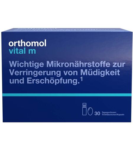 Nahrungsergänzungsmittel sind kein Ersatz für eine ausgewogene und abwechslungsreiche Ernährung und eine gesunde Lebensweise. Orthomol Vital m Orthomol Vital m ist eine umfassend formulierte Mikronährstoffkombination und enthält über 25 spezifische Nährstoffe. Mit Vitamin B12 und Magnesium zur Verringerung von Müdigkeit und Erschöpfung sowie als Beitrag zu einem normalen Energiestoffwechsel. Müdigkeit und Erschöpfung im Alltag Unser Alltag wird immer schnelllebiger. Phasen hoher Belastung reihen sich aneinander, egal ob beruflich oder privat. Das Resultat: Man fühlt sich müde und erschöpft. Gerade jetzt ist es umso wichtiger, auf eine ausgewogene Mikronährstoffversorgung zu achten. Orthomol Vital m ist ein Nahrungsergänzungsmittel. Es enthält wichtige Mikronährstoffe u. a. Vitamin B12 und Magnesium zur Verringerung von Müdigkeit und Erschöpfung sowie Omega-3-Fettsäuren. Orthomol Vital m Orthomol Vital m ist eine umfassend formulierte Mikronährstoffkombination und enthält über 25 spezifische Nährstoffe. Mit Vitamin B12 und Magnesium zur Verringerung von Müdigkeit und Erschöpfung sowie als Beitrag zu einem normalen Energiestoffwechsel. Müdigkeit und Erschöpfung im Alltag Unser Alltag wird immer schnelllebiger. Phasen hoher Belastung reihen sich aneinander, egal ob beruflich oder privat. Das Resultat: Man fühlt sich müde und erschöpft. Gerade jetzt ist es umso wichtiger, auf eine ausgewogene Mikronährstoffversorgung zu achten. Orthomol Vital m ist ein Nahrungsergänzungsmittel. Es enthält wichtige Mikronährstoffe u. a. Vitamin B12 und Magnesium zur Verringerung von Müdigkeit und Erschöpfung sowie Omega-3-Fettsäuren. Die Vital-Formel für mehr Energie Orthomol Vital m versorgt Dich jeden Tag mit wichtigen Mikronährstoffen. Hierzu gehört u. a. der gesamte Vitamin-B-Komplex inkl. 450 µg Vitamin B12 je Tagesportion. Es enthält Omega-3-Fettsäuren sowie weitere Vitamine und Mineralstoffe. Bei Müdigkeit und Erschöpfung. Für mehr Energie im Alltag.1 B-Vitamine – komplex und wichtig für die Nerven Vitamin B, vor allem Vitamin B12, gilt als Nahrung“ für die Nerven. Es sorgt für eine normale Nervenfunktion und unterstützt zudem den Energiestoffwechsel. Ein ausgeglichener Vitamin-B12-Spiegel kann zudem Müdigkeit und Erschöpfung verringern. Personengruppe, die besonders auf ihre Vitamin-B-Versorgung achten sollten Unterschiedliche Darreichungsformen und Geschmacksrichtungen Orthomol Vital m ist in drei Darreichungen erhältlich: Als Granulat zum Auflösen, als Tabletten/Kapseln sowie als praktische Trinkfläschchen. Entscheide selbst, was am besten zu Dir passt. Das Granulat ist zudem in zwei unterschiedlichen Geschmacksrichtungen erhältlich: Orange und Grapefruit. Deine tägliche Unterstützung. Die praktischen Tagesportionen ermöglichen Dir eine einfache und unkomplizierte Einnahme und lassen sich optimal in den Alltag integrieren. Da Mikronährstoffe täglich vom Körper benötigt werden, ist eine regelmäßige Verwendung über einen längeren Zeitraum empfehlenswert.... ...
