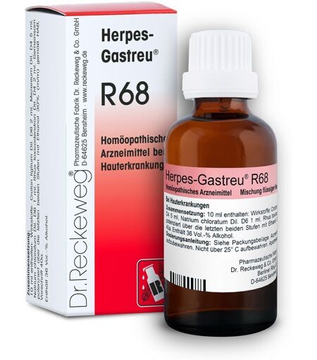 Was ist Herpes-Gastreu® R 68 und wofür wird es angewendet?Herpes-Gastreu® R 68 ist ein homöopathisches Arzneimittel bei Hauterkrankungen. Anwendungsgebiete: Die Anwendungsgebiete entsprechen den homöopathischen Arzneimittelbildern der einzelnen Bestandteile. Dazu gehören: Krankhafte Hautveränderungen bei Windpocken oder Gürtelrose. Hinweis: Bei anhaltenden, unklaren oder neu auftretenden Beschwerden sollte ein Arzt aufgesucht werden.Wie ist Herpes-Gastreu® R 68 anzuwenden?Nehmen Sie Herpes-Gastreu® R 68 immer genau nach der Anweisung in dieser Packungsbeilage ein. Bitte fragen Sie bei Ihrem Arzt oder Apotheker nach, wenn Sie sich nicht ganz sicher sind. Soweit nicht anders verordnet: Bei akuten Zuständen nehmen Erwachsene jeweils 5 Tropfen bis höchstens 6-mal täglich. Kinder ab 6 Jahren bis unter 12 Jahren sowie Jugendliche unter 18 Jahre erhalten zwei Drittel der Erwachsenendosis. Eine über eine Woche hinausgehende Anwendung sollte nur nach Rücksprache mit einem homöopathisch erfahrenen Therapeuten erfolgen. Dauer der Anwendung: Auch homöopathische Arzneimittel sollten ohne ärztlichen Rat nicht über längere Zeit eingenommen werden.Das Arzneimittel Herpes-Gastreu® R 68 enthält:10 ml enthalten: Wirkstoffe: Croton tiglium Dil. D6 2 ml, Mezereum Dil. D4 5 ml, Natrium chloratum Dil. D6 1 ml, Rhus toxicodendron Dil. D4 2 ml. Gemeinsam potenziert über die letzten beiden Stufen mit Ethanol 30% (m/m) gemäß HAB, Vorschrift 40a ...