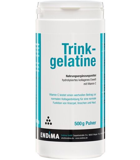 Nahrungsergänzungsmittel sind kein Ersatz für eine ausgewogene und abwechslungsreiche Ernährung und eine gesunde Lebensweise. Endima® TrinkgelatineNahrungsergänzungsmittel mit hydrolysierten, kollagenen Eiweiß und Vitamin C. Gut löslich, geschmacksneutral und nicht quellend. Vitamin C leistet einen wertvollen Beitrag zurnormalen Kollagenbildung für eine normaleFunktion von Knorpel, Knochen und Haut.Zutaten:Kollagenhydrolysat (vom Rind) 99,8%, Vitamin C. Zusammensetzung pro 100 g Pulver pro empf. tägl. Verzehrsmenge (12 g) %* Energie 1.581 kJ 372 kcal 190 kJ 45 kcal 2,3 2,3 Fett 0 g 0 g 0 davon gesättigte Fettsäuren 0 g 0 g 0 Kohlenhydrate 0 g 0 g 0 davon Zucker 0 g 0 g 0 Eiweiß 93 g 11 g 22 Salz** 0,8 g 0,1 g 1,6 *: Referenzmenge für einen durchschnittlichen Erwachsenen (8.400 KJ / 2.000 kcal) **: Der Salzgehalt ist ausschließlich auf die Anwesenheit natürlich vorkommendenNatriums zurückzuführen. Vitamine und sonstige Stoffe mit ernährungsspezifischer oder physiologischer Wirkung pro empf. tägl. Verzehrsmenge (12 g) % NRV* Kollagenhydrolysat 11,97 g ** Vitamin C 24 mg 30 *: NRV = Nährstoffbezugswerte gemäß Lebensmittelinformationsverordnung **: kein NRV-Wert vorliegend Verzehrsempfehlung: Verzehrsempfehlung: Täglich 12 Gramm Pulver (2 gestrichene Messlöffel) z.B. in Wasser, Milch, Joghurt oder Speisen einrühren. Hinweis: Die angegebene empfohlene tägliche Verzehrmenge nicht überschreiten. Aufbewahrungshinweis:Dose immer gut verschlossen, kühl, trocken und außerhalb der Reichweite von kleinen Kindern aufbewahren. Nettofüllmenge: 500 g Pulver Herstellerdaten: Endima GmbH Zeppelinstraße 21 a 66557 Illingen ...