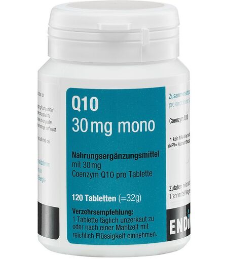 Nahrungsergänzungsmittel sind kein Ersatz für eine ausgewogene und abwechslungsreiche Ernährung und eine gesunde Lebensweise.Endima® Q10 30 mg Mono Tabletten Nahrungsergänzungsmittel mit 30 mg Coenzym Q10 pro Tablette.Zutaten: Mikrokristalline Cellulose, Coenzym Q10 10,5%, Trennmittel Magnesiumsalze von Speisefettsäuren, Siliciumdioxid. Zusammensetzung pro empfohlener tägl. Verzehrsmenge (1 Tablette) NRV* Coenzym Q10 30,0 mg * * kein NRV-Wert vorliegendVerzehrsempfehlung:1 Tablette täglich unzerkaut zu oder nach einer Mahlzeit mit reichlich Flüssigkeit einnehmen.Aufbewahrung: Dose immer gut verschlossen, kühl, trocken und außerhalb der Reichweite von kleinen Kindern aufbewahren.Nettofüllmenge: 120 Tabletten (=32g).Herstellerdaten: Endima GmbH Zeppelinstraße 21 a 66557 Illingen ...