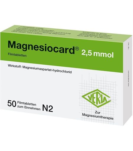 Ein Mangel an dem lebenswichtigen Mineralstoff Magnesium kann viele Ursachen haben, z.B. einseitige Ernährungsgewohnheiten, ein erhöhter Magnesiumbedarf (z.B. Schwangerschaft, Stillzeit) oder erhöhte Verluste an Magnesium, z.B. bei Diabetes mellitus oder bedingt durch Alltagsstress. Aufgrund der umfangreichen Funktionen von Magnesium im Organismus kann sich ein Mangel an allen Ecken und Enden bemerkbar machen, z.B. Waden- und Zehenkrämpfe, Verspannungen im Nacken-, Schulter- und Rückenbereich, Lidzucken, Nervosität, innere Unruhe, Kopf- und Herzschmerzen oder vorzeitige Wehen in der Schwangerschaft. Magnesiocard® enthält die spezielle, patentgeschützte Magnesiumverbindung Magnesiumaspartat-hydrochlorid, die sehr gut vom Körper aufgenommen wird. Sie erhalten Magnesiocard® je nach Geschmack und Bedarf in unterschiedlichen Darreichungsformen (Filmtabletten, Pulver zum Trinken, Brausetabletten, Beutel mit retardierten Filmtabletten) und Wirkstoffstärken rezeptfrei in Ihrer Apotheke.Die Magnesiocard®-Produkte sind so dosiert, dass sie auch mehrmals pro Tag eingenommen werden können. Dies hat den Vorteil einer bestmöglichen Aufnahme von Magnesium in den Körper, da kleine Mengen - mehrmals täglich eingenommen - besser aufgenommen werden können als große Einmal-Dosierungen. Alle Magnesiocard® Produkte sind glutenfrei und enthalten keine Lactose. Anwendung:Magnesiocard® Arzneimittel sind die idealen Produkte zur Behandlung bei Magnesiummangel. Es wird insbesondere angewendet bei Magnesiummangel-bedingten Herzbeschwerden, bei durch Diabetes mellitus (Zuckerkrankheit) bedingten Magnesiummangel sowie bei Magnesiummangel bei hyperaktiven Kindern. Für nähere Informationen fordern Sie bitte unsere Magnesiocard® Patienteninformationen an.Auch in der Schwangerschaft wird Magnesiocard® aufgrund klinischer Erfahrungen häufig eingesetzt. Die Schwangerschaft - wenn zwei Herzen schlagen - ist eine klassische Magnesiummangel-Situation: ein Magnesiummangel kann hier zu Wadenkrämpfen und sogar zu vorzeitigen Wehen führen.Magnesiocard® 2,5 mmol, Filmtabletten:614,8 mg Magnesiumaspartat-hydrochlorid 3 H2O, entsprechend 60,8 mg Magnesium pro Filmtablette. Wirkstoff:Magnesiumaspartat-hydrochloridAnwendungsgebiete:Behandlung von therapiebedürftigen Magnesium-Mangelzuständen, die keiner Injektion/Infusion bedürfen. Nachgewiesener Magnesiummangel, wenn er Ursache für Störungen der Muskeltätigkeit (neuromuskuläre Störungen, Wadenkrämpfe) ist. ...