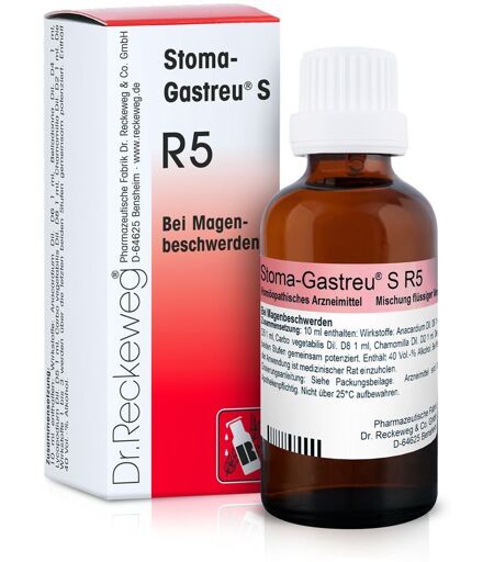 Was ist Stoma-Gastreu® S R 5 und wofür wird es angewendet? Stoma-Gastreu® S R 5 ist ein homöopathisches Arzneimittel bei Erkrankungen der Verdauungsorgane. Anwendungsgebiete: Die Anwendungsgebiete leiten sich von den homöopathischen Arzneimittelbildern ab. Dazu gehören: Besserung von Magenbeschwerden. Bei allen unklaren und plötzlich einsetzenden Beschwerden sollte ein Arzt aufgesucht werden, da es sich um Erkrankungen handeln kann, die einer ärztlichen Abklärung und Behandlung bedürfen.Wie ist Stoma-Gastreu® S R 5 anzuwenden? Nehmen Sie Stoma-Gastreu® S R 5 immer genau nach der Anweisung in dieser Packungsbeilage ein. Bitte fragen Sie bei Ihrem Arzt oder Apotheker nach, wenn Sie sich nicht ganz sicher sind. Soweit nicht anders verordnet: 1- bis 3-mal täglich je 5 Tropfen einnehmen. Bei Besserung der Beschwerden ist die Häufigkeit der Anwendung zu reduzieren. Dauer der Anwendung:Auch homöopathische Medikamente sollten ohne ärztlichen Rat nicht über längere Zeit eingenommen werden.Wenn Sie weitere Fragen zur Anwendung des Arzneimittels haben, fragen Sie Ihren Arzt oder Apotheker.Das Arzneimittel Stoma-Gastreu® S R 5 enthält:10 ml enthalten: Wirkstoffe: Anacardium Dil. D6 1 ml, Belladonna Dil. D4 1 ml, Lycopodium Dil. D5 1 ml, Carbo vegetabilis Dil. D8 1 ml, Chamomilla Dil. D2 1 ml. Die Wirkstoffe 1 bis 3 werden über die letzten beiden Stufen gemeinsam potenziert. Sonstiger Bestandteil: Ethanol 30% (m/m).1 ml entspricht 18 Tropfen. ...