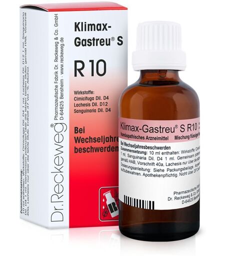 Was ist Klimax-Gastreu® S R 10 und wofür wird es angewendet? Klimax-Gastreu® S R 10 ist ein homöopathisches Arzneimittel bei Erkrankungen der weiblichen Geschlechtsorgane. Anwendungsgebiete: Die Anwendungsgebiete leiten sich von den homöopathischen Arzneimittelbildern ab. Dazu gehören: Wechseljahresbeschwerden wie Hitzewallungen, Schweißausbrüche, unregelmäßige Blutungen. Bei anhaltenden, unklaren oder neu auftretenden Beschwerden sollte ein Arzt aufgesucht werden, da es sich um Erkrankungen handeln kann, die einer ärztlichen Abklärung bedürfen.Wie ist Klimax-Gastreu® S R 10 anzuwenden? Nehmen Sie Klimax-Gastreu® S R 10 immer genau nach der Anweisung in dieser Packungsbeilage ein. Bitte fragen Sie bei Ihrem Arzt oder Apotheker nach, wenn Sie sich nicht ganz sicher sind. Soweit nicht anders verordnet: Bei akuten Zuständen alle halbe bis ganze Stunde, höchstens 6-mal täglich, je 5 Tropfen einnehmen. Eine über eine Woche hinausgehende Anwendung sollte nur nach Rücksprache mit einem homöopathisch erfahrenen Therapeuten erfolgen. Bei chronischen Verlaufsformen 1 bis 3-mal täglich je 5 Tropfen einnehmen. Bei Besserung der Beschwerden ist die Häufigkeit der Anwendung zu reduzieren. Dauer der Anwendung: Auch homöopathische Arzneimittel sollten ohne ärztlichen Rat nicht über längere Zeit eingenommen werden. Bei Anwendung über mehr als 4 Wochen sollten die Leberfunktionswerte kontrolliert werden. Wenn Sie weitere Fragen zur Anwendung des Arzneimittels haben, fragen Sie Ihren Arzt oder Apotheker. Das Arzneimittel Klimax-Gastreu® S R 10 enthält:10 ml enthalten: Wirkstoffe: Cimicifuga Dil. D4 1 ml, Lachesis Dil. D12 1 ml, Sanguinaria Dil. D4 1 ml. Gemeinsam potenziert über die letzten beiden Stufen gemäß HAB, Vorschrift 40a, Lachesis nur über die letzte Stufe. Sonstiger Bestandteil: Ethanol 30% (m/m). ...