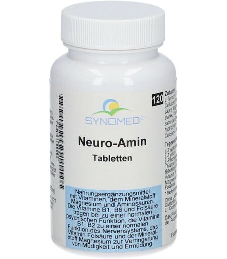 Nahrungsergänzungsmittel sind kein Ersatz für eine ausgewogene und abwechslungsreiche Ernährung und eine gesunde Lebensweise. Neuro L-Tryptophan Tabletten Nahrungsergänzungsmittel mit Vitaminen, dem Mineralstoff Magnesium und Aminosäuren. Die Vitamine B1, B6 und Folsäure tragen bei zu einer normalen psychischen Funktion, die Vitamine B1, B2 zu einer normalen Funktion des Nervensystems, das Vitamin Folsäure und der Mineralstoff Magnesium zur Verringerung von Müdigkeit und Ermüdung. Zutaten: L-Tyrosin, L-Tryptophan, Füllstoff Mikrokristalline Cellulose und Cellulose-Pulver, Magnesiumsalze der Zitronensäure, Magnesiumoxid, L-Phenylalanin, Kartoffelstärke, Trennmittel Talkum, Thiaminhydrochlorid, Trennmittel Magnesiumsalze der Speisefettsäuren (pflanzlich), Pyridoxinhydrochlorid, Riboflavin, Füllstoff Siliciumdioxid, , Pteroylmonoglutaminsäure.Ohne Lactose, Hefe, Farbstoffe oder Konservierungsstoffe. Glutenfrei. Nährwertangaben: Tagesverzehrsmenge (= 2 Tabletten) enthält: L-Tryptophan 240 mg (**) L-Tyrosin 440 mg (**) L-Phenylalanin 60 mg (**) Thiamin (Vitamin B1) 10 mg (909%*) Riboflavin (Vitamin B2) 10 mg (714%*) Vitamin B6 10 mg (714%*) Folsäure 200 µg ( 100%*) Magnesium 10 mg *Referenzmenge nach LMIV (NRV) **Keine Empfehlung der LMIV vorhanden.Verzehrempfehlung: Täglich morgens 1 Tablette nüchtern und abends 1 Tablette vor dem Schlafengehen mit ausreichend Flüssigkeit verzehren. Hinweis:Die angegebene empfohlene Tagesmenge darf nicht überschritten werden.Aufbewahrung: Kühl (6-25 °C) und lichtgeschützt lagern. Außerhalb der Reichweite von kleinen Kindern aufbewahren.Nettofüllmenge: 120 Tabletten = 66,0 g HerstellerSynomed GmbHFlamweg 132-13425335 Elmshorn ...