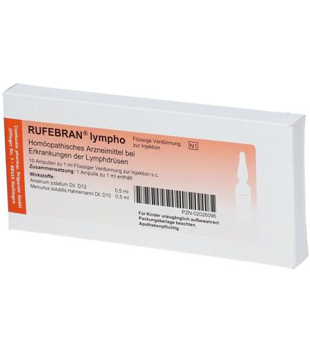 RUFEBRAN® lymphoFlüssige Verdünnung zur InjektionStoff- oder Indikationsgruppe:Homöopathisches Arzneimittel bei Erkrankungen der Lymphdrüsen.Anwendungsgebiete:Die Anwendungsgebiete leiten sich von den homöopathischen Arzneimittelbildern ab. Dazu gehören: Lymphdrüsenschwellungen und zur unterstützenden Behandlung bei Entzündungen der Lymphdrüsen.Bei schmerzloser Lymphdrüsenschwellung sowie bei allen anhaltenden, unklaren oder neu auftretenden Beschwerden ist ein Arzt aufzusuchen, da es sich um Erkrankungen handeln kann, die einer ärztlichen Abklärung bedürfen.Gegenanzeigen:Wann dürfen Sie RUFEBRAN® lympho erst nach Rücksprache mit dem Arzt anwenden?Bei Schilddrüsenerkrankungen nicht ohne ärztlichen Rat anwenden.Vorsichtsmaßnahmen für die Anwendung:Was müssen Sie in der Schwangerschaft und Stillzeit beachten?Da keine ausreichend dokumentierten Erfahrungen zur Anwendung in der Schwangerschaft und Stillzeit vorliegen, sollte RUFEBRAN® lympho nur nach Rücksprache mit dem Arzt angewendet werden.Was ist bei Kindern zu berücksichtigen?Zur Anwendung dieses Arzneimittels bei Kindern liegen keine ausreichend dokumentierten Erfahrungen vor. Es soll deshalb bei Kindern unter 12 Jahren nicht angewendet werden. Wechselwirkungen mit anderen Arzneimitteln oder anderen Mitteln:Keine bekannt.Allgemeiner Hinweis:Die Wirkung eines homöopathischen Arzneimittels kann durch allgemein schädigende Faktoren in der Lebensweise und durch Reiz- und Genussmittel ungünstig beeinflusst werden. Falls Sie sonstige Arzneimittel anwenden, fragen Sie Ihren Arzt.Dosierungsanleitung, Art und Dauer der Anwendung:Soweit nicht anders verordnet:Bei akuten Zuständen parenteral 1 - 2 ml bis zu 3mal täglich s.c. injizieren. Eine über eine Woche hinausgehende Anwendung sollte nur nach Rücksprache mit einem homöopathisch erfahrenen Therapeuten erfolgen.Bei chronischen Verlaufsformen parenteral 1 - 2 ml täglich s.c. injizieren. Bei Besserung der Beschwerden ist die Häufigkeit der Anwendung zu reduzieren.Auch homöopathische Arzneimittel sollten nicht über längere Zeit ohne ärztlichen Rat angewendet werden.Überdosierung und andere Anwendungsfehler:Wenn Sie eine größere Menge RUFEBRAN® lympho angewendet haben, als Sie sollten, sind in der Regel keine nachteiligen Folgen zu erwarten.Wenn Sie die Anwendung von RUFEBRAN® lympho vergessen haben, holen Sie diese bitte nach, sobald Sie es bemerken. Wenden Sie aber nicht die doppelte Dosis an.Wenn Sie die Anwendung von RUFEBRAN® lympho abbrechen, können sich Ihre Beschwerden wieder verschlimmern oder erneut auftreten.Wenn Sie weitere Fragen zur Anwendung des Arzneimittels haben, fragen Sie Ihren Arzt, Ihren Apotheker oder einen homöopathisch erfahrenen Therapeuten.Nebenwirkungen:Nach Anwendung von RUFEBRAN® lympho kann verstärkt Speichelfluss auftreten; das Mittel ist dann abzusetzen.Außerdem können aufgrund des enthaltenen Quecksilbers gelegentlich allergische Reaktionen auftreten.Welche Gegenmaßnahmen sind bei Nebenwirkungen zu ergreifen?Bei... ...