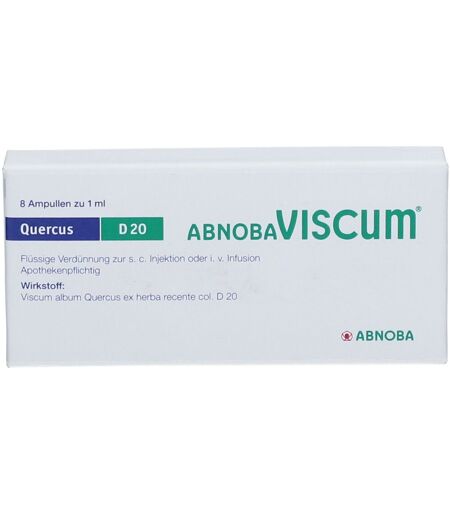 Wirkstoff:Jede Ampulle enthält 1 ml Viscum album Quercus ex herba recente col. Dil. D20Was ist abnoba VISCUM Und Wofür Wird es angewendet?abnobaVISCUM ist ein anthroposophisches Arzneimittel zur erweiterten Behandlung bei Geschwulstkrankheiten.Anwendungsgebiete:Gemäß der anthroposophischen Menschen- und Naturerkenntnis wird abnoba-VISCUM angewendet, um bei Erwachsenen die Form- und Integrationskräfte zur Auflösung und Wiedereingliederung verselbständigter Wachstumsprozesse anzuregen, z.B.bei bösartigen Geschwulstkrankheiten, auch mit begleitenden Störungen der blutbildenden Organebei gutartigen Geschwulstkrankheitenzur Vorbeugung gegen Rückfälle (Rezidivprophylaxe) nach Geschwulstoperationenbei Vorstufen bestimmter Krebserkrankungen (definierte Präkanzerosen). Wie ist abnobaViSCUM anzuwenden?Art der Anwendung:Die subkutane Injektion sollte nach Möglichkeit in Tumor - bzw. Metastasennähe, ansonsten an stets wechselnden Körperstellen (unterschiedliche Stellen im Bauchbereich, ggf. Oberschenkel oder Oberarm) erfolgen.Nicht in entzündete Hautbereiche oder Bestrahlungsfelder injizieren. Es ist auf streng subkutane Injektionstechnik zu achten.Vorsichtshalber wird empfohlen, abnobaVISCUM nicht mit anderen Arzneimitteln in einer Spritze aufzuziehen.Nach Säuberung der Einstichstelle (z.B. durch Abreiben mit 70%igem Alkohol) eine Hautfalte bilden und die Injektionsnadel schräg einstechen. Den Spritzenstempel leicht zurückziehen. Sollte Blut erscheinen, wurde ein Blutgefäß getroffen.Die Injektion in diesem Fall an einer anderen Stelle wiederholen. Wenn kein Blut erscheint, langsam injizieren, anschließend die Nadel herausziehen und auf die Einstichstelle kurz mit einem Tupfer drücken.Es wird in jedem Fall empfohlen, die Injektionstechnik durch eine darin erfahrene Person zu erlernen.Ampullen sind unmittelbar nach dem Öffnen zu injizieren. Angebrochene Ampullen dürfen nicht mehr für eine spätere Injektion verwendet werden.Nur die Potenzstufen D 10, D 20 und D 30:Für die Potenzstufen D 10, D 20 und D 30 kann in besonderen Fällen die erforderliche Dosis einer Infusionslösung zugemischt (physiologische Kochsalzlösung oder 5%-ige Glukoselösung) und langsam intravenös infundiert werden. Die Infusionsdauer sollte für 250 ml mindestens 90 min. dauern.Dosierung und Häufigkeit der AnwendungRichten sich nach der jeweiligen körperlichen Verfassung und werden individuell von Ihrem Arzt festgelegt.Dosierung und Häufigkeit der Anwendung:Einleitungsphase:Soweit nicht anders angegeben, erfolgt die Dosierung stets mit 1 ml der Injektionslösung der angegebenen Stärke bzw. Potenzstufe. Sie sollten die Behandlung mit der Stärke 0,02 mg dreimal wöchentlich beginnen (für die Stärken 0,02 mg, 0,2 mg, 2 mg, 20 mg und Potenzstufe D 6) und dann solange vorsichtig mit den nächst höheren Dosen stufenweise weiterführen, bis Sie die optimale Dosis erreicht haben.Die Dosierung erfolgt grundsätzlich individuell nach Anweisung des Arztes und richtet sich nach Ihrer... ...