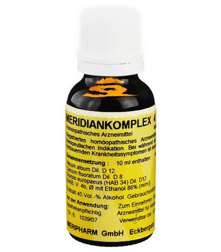 Akupunkturmeridian des MAGENSRegistriertes homöopathisches Arzneimittel ohne Angabe einer therapeutischen Indikation. Zusammensetzung:Viscum album Dil. D 12, Calcium fluoratum Dil. D 8,Scorpio europaeus Dil. D 12 aa. p., Alkoholgehalt 45 Vol.%. Nebenwirkungen:Keine bekannt. Wie bei allen homöopathischen Arzneimitteln ist auch hier in seltenen Fällen eine Erstverschlimmerung möglich. Gegenanzeigen:Keine bekannt. Nicht anwenden bei Alkoholkranken. Wegen des Alkoholgehaltes bei Leberkranken, Epileptikern, Hirnkranken oder Hirngeschädigten nur nach Rücksprache mit dem Arzt anwenden. Wechselwirkungen mit anderen Mitteln:Keine bekannt. Siehe unter Erläuterungen im allgemeinen Teil.Anwendung und Dosierung als energetisches Mittel aufgrundlangjähriger Erfahrung:Anfangsdosis 3-mal täglich 10-20 Tropfen, Erhaltungsdosis 2-mal täglich 10-15 Tropfen nüchtern oder zwischen den Mahlzeiten auf die Zunge oder in wenig Wasser. Kinder die Hälfte. Beachten Sie die Dosierungsrichtlinien im allgemeinen Teil.Eigenschaften:Der MERIDIANKOMPLEX 4 hat die Eigenschaft, das energetische Geschehen auf dem Magen-Meridian (Primärorgan Magen) zu regulieren. Den Regeln der Klassischen Akupunktur und der TCM folgend achte man auf sekundär bedingte und induzierte energetische Störungen und Erkrankungen im Verlauf des Magen-Meridians. ...