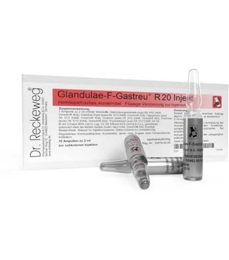 Was ist Glandulae-F-Gastreu® R 20 Injekt und wofür wird es angewendet?Glandulae-F-Gastreu® R 20 Injekt ist ein registriertes homöopathisches Arzneimittel, daher ohne Angabe einer therapeutischen Indikation. Hinweis: bei während der Anwendung des Arzneimittels fortdauernden Krankheitssymptomen ist medizinischer Rat einzuholen.Wie ist Glandulae-F-Gastreu® R 20 Injekt anzuwenden?Wenden Sie Glandulae-F-Gastreu® R 20 Injekt immer genau nach der Anweisung in dieser Packungsbeilage an. Bitte fragen Sie bei Ihrem Arzt oder Apotheker nach, wenn Sie sich nicht ganz sicher sind. Soweit nicht anders verordnet: Anfangs täglich, später 1- bis 2- mal wöchentlich 2 ml subkutan injizieren. Hinweis: Nicht verbrauchte Reste des Arzneimittels sind nach Anbruch zu verwerfen. Wie lange soll Glandulae-F-Gastreu® R 20 Injekt angewendet werden?Auch homöopathische Arzneimittel sollten nicht über längere Zeit ohne ärztlichen Rat angewendet werden. Wenn Sie weitere Fragen zur Anwendung des Arzneimittels haben, fragen Sie Ihren Arzt oder Apotheker.Das Arzneimittel Glandulae-F-Gastreu® R 20 Injekt enthält:1 Ampulle zu 2 ml enthält: Wirkstoffe: Glandula suprarenalis (suis) Dil. D12 (HAB, Vorschr. 42a), Glandula thymi (suis) Dil. D12 (HAB, Vorschr. 42a), Hypophysis (suis) Dil. D12 (HAB, Vorschr. 42a), Ovarium (suis) Dil. D12 (HAB, Vorschr. 42a), Pancreas (suis) Dil. D12 (HAB, Vorschrift 42a), Thyreoidinum (suis) Dil. D12 [HAB, SV 5a, Ø mit Ethanol 86% (m/m), Lsg. D3 mit Ethanol 62% (m/m)] je 0,2 g, gemeinsam potenziert über die letzten beiden Stufen nach HAB, Vorschrift 40a. Sonstige Bestandteile: Wasser für Injektionszwecke, Natriumchlorid zur Isotonisierung. ...