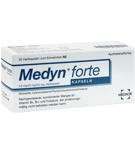 Zusammensetzung1 Hartkapsel enthält:Arzneilich wirksame Bestandteile: Cyanocobalamin (Vitamin B12) 0,5 mg, Pyridoxinhydrochlorid (Vitamin B6) 25 mg, Folsäure 2,5 mg Sonstige Bestandteile: Maltodextrin, Citronensäure-Monohydrat, Natriumcitrat, mikrokristalline Cellulose, hochdisperses Siliciumdioxid, Magnesiumstearat, Titandioxid E 171, Chinolingelb E 104, Eisenoxidrot E 172, Eisenoxidgelb E 172, Natriumdodecylsulfat, gereinigtes Wasser, Gelatine. Stoff- oder IndikationsgruppeVitamineAnwendungsgebieteNachgewiesener, kombinierter Mangel an Vitamin B6, B12 und Folsäure, der ernährungsmäßig nicht behoben werden kann.GegenanzeigenWann dürfen Sie Medyn® forte Kapseln nicht anwenden?Medyn® forte Kapseln dürfen nicht angewendet werden bei Megaloblasten-Anämie infolge eines isolierten Vitamin B12-Mangels (z.B. infolge Mangels an Instrinsic-Faktor) oder bei isoliertem Folsäure-Mangel. Was müssen Sie in Schwangerschaft und Stillzeit beachten?In der Schwangerschaft und Stillzeit sollte der tägliche Vitaminbedarf mit einer ausgewogenen Ernährung sichergestellt werden. Dieses Arzneimittel ist (aufgrund seiner Wirkstoffmenge) nur zur Behandlung eines Vitaminmangels bestimmt und darf daher nur nach sorgfältiger Nutzen/Risiko-Abwägung durch den Arzt angewendet werden. Systematische Untersuchungen zu einer Anwendung von Medyn® forte Kapseln in der Schwangerschaft liegen nicht vor.Vitamin B6 und B12 gehen in die Muttermilch über. Vorsichtsmaßnahmen für die Anwendung und Warnhinweise Welche Vorsichtsmaßnahmen müssen Sie beachten?Bei langfristiger Einnahme von Tagesdosen über 50 mg Vitamin B6 sowie bei kurzfristiger Einnahme von Dosen im Grammbereich wurden Kribbeln und Ameisenlaufen an Händen und Füßen (Anzeichen einer peripherensensorischen Neuropathie, bzw. von Paraesthesien) beobachtet. Wenn Sie Kribbeln und Ameisenlaufen bei sich beobachten, wenden Sie sich bitte an Ihren behandelnden Arzt. Dieser wird die Einnahmemenge überprüfenund wenn nötig das Medikament absetzen.Wechselwirkungen mit anderen MittelnWelche anderen Arzneimittel beeinflussen die Wirkung von Medyn® forte Kapseln oder werden in ihrer Wirkung beeinflusst?Therapeutische Dosen von Pyridoxinhydrochlorid können die Wirkung von L-Dopa abschwächen. Es bestehen Wechselwirkungen mit INH, DPenicillamin, Cycloserin und Hydralazin.Die enterale Resorption von Folsäure ist verringert bei gleichzeitiger Gabe von Primidon, Diphenylhydantoin, Phenobarbital, Carbamazepin, Valproat, Sulfasalazin, hormonalen Antikonzeptiva sowie Folsäure-Antagonisten wie Methotrexat, Trimethroprim, Pyrimethamin und Triamteren.Beachten Sie bitte, dass diese Angaben auch für vor kurzem angewandte Arzneimittel gelten können.Dosierungsanleitung, Art und Dauer der AnwendungWie viel und wie oft sollten Sie Medyn® forte Kapseln anwenden?Wie und wann sollten Sie Medyn® forte Kapseln einnehmen?Wie lange sollten Sie Medyn® forte Kapseln anwenden?Soweit nicht anders verordnet, soll täglich eine Hartkapsel eingenommen werden.... ...