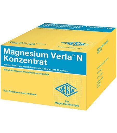 5 mmol Pulver zur Herstellung einer Lösung zum EinnehmenWirkstoff: Magnesiumbis(hydrogenaspartat)Was ist Magnesium Verla® N Konzentrat und wofür wird es angewendet?Magnesium Verla® N Konzentrat ist ein Mineralstoffpräparat.Magnesium Verla® N Konzentrat wird angewendet zur Behandlung von therapiebedürftigen Magnesiummangelzuständen, die keiner Injektion/ Infusion bedürfen;bei Magnesiummangel, wenn er Ursache für Störungen der Muskeltätigkeit (neuromuskuläre Störungen, Wadenkrämpfe) ist.Wie ist Magnesium Verla ® N Konzentrat einzunehmen? Nehmen Sie Magnesium Verla® N Konzentrat immer genau nach der Anweisung in dieser Packungsbeilage ein. Bitte fragen Sie bei Ihrem Arzt oder Apotheker nach, wenn Sie sich nicht ganz sicher sind.Dosierung Falls vom Arzt nicht anders verordnet, ist die übliche Dosis:Die Dosierung richtet sich nach dem Grad des Magnesiummangels.Kinder bis zum 4. Lebensjahr: 1 Beutel 1 mal täglich (entsprechend 122 mg Magnesium).Kinder von 4-12 Jahren: 1 Beutel 2 mal täglich (entsprechend 243 mg Magnesium).Ältere Kinder und Erwachsene: 1 Beutel 1-3 mal täglich (entsprechend 122-365 mg Magnesium).Art der AnwendungVerrühren Sie bitte den Inhalt eines Beutels in einem halben Glas Wasser, Tee oder Fruchtsaft und trinken Sie den Inhalt des Glases vollständig aus. Magnesium Verla® N Konzentrat sollte vor dem Essen eingenommen werden, da sich dadurch die Aufnahme vom Magen-Darmkanal in den Blutkreislauf verbessert.Dauer der AnwendungEmpfehlenswert ist eine Einnahme über 4 Wochen. Auch eine Dauertherapie (über Jahre) ist bei normaler Nierenfunktion unbedenklich, da überschüssiges Magnesium über die Niere ausgeschieden wird. Bitte sprechen Sie mit Ihrem Arzt oder Apotheker, wenn Sie den Eindruck haben, dass die Wirkung von Magnesium Verla® N Konzentrat zu stark oder zu schwach istWas Magnesium Verla® N Konzentrat enthält:Der Wirkstoff ist: Magnesiumbis(hydrogenaspartat)1 Beutel (5 g) Pulver zur Herstellung einer Lösung zum Einnehmen enthält:Magnesiumbis(hydrogenaspartat)-Dihydrat (berechnet wasserfrei) 1442 mg. Magnesiumgehalt: 5 mmol = 121,5 mgDie sonstigen Bestandteile sind: Riboflavin, Sucrose, Citronensäure, Saccharin-Natrium, hochdisperses Siliciumdioxid, Mandarinen-Aroma (enthält Lactose). ...