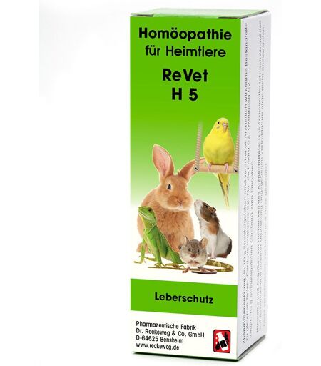 ReVet® H 5 Globuli für Heimtiere Indikation: Leberschutz. Vergiftungen, noch nicht entgiftete Zustände, Bauchspeicheldrüsenerkrankungen, Lebererkrankungen, Futtermittel-Intoxikation, Verdauungsstörung, Störung der Verdauung von Futter. Dosierung: In Abhängigkeit vom Körpergewicht erhalten: Kleinnager (Mäuse, Ratten, Meerschweinchen), Zier- und Singvögel, Terrarientiere, Brieftauben, Frettchen, Kaninchen (die nicht der Gewinnung von Lebensmitteln dienen) ca. 1 bis 3 Globuli, 2- bis 3-mal pro Tag über einige Tage; bei zunehmender Besserung seltener. Die Globuli lösen sich gut in Wasser auf und können auch mit dem Trinkwasser verabreicht werden. Inhaltsstoffe: In 10 g Streukügelchen sind verarbeitet: Carduus marianus C2, Flor de piedra C2, Okoubaka C2. Sonstiger Bestandteil: Sucrose. ...