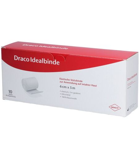 Draco Idealbinde Die Draco Idealbinde ist eine elastische Kurzzugbinde nach DIN 61632. Sie eignet sich als Stützverband, Entlastungsverband, zur starken Fixierung und zur Prävention im Sport. Draco Idealbinden sind schlingkantig gewebt, sind mehrfach verwendbar, waschbar bis 95° und gewinnen durch die Wäsche beim Tragen verlorengegangene Elastizität wieder zurück. Damit die Binde nach dem Waschen elastisch bleibt, dürfen weder Weichspüler noch Wäschetrockner verwendet werden. Draco Idealbinden sind Kurzzugbinden mit einer gedehnten Länge von 5m. Sie sind in unterschiedlichen Breiten verfügbar, wahlweise einzeln cellophaniert oderin der Ärztepackung à 10 Stück. Material: •100 % Baumwolle ...