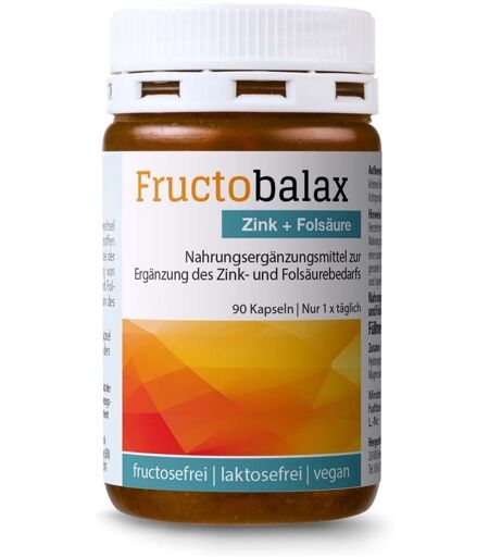 Bitte achten Sie auf eine abwechslungsreiche und ausgewogene Ernährung und gesunde Lebensweise. Wozu dient FRUCTOBALAX? Menschen mit Fruchtzucker-Unverträglichkeit leiden vielfach unter einem Mangel an Zink und Folsäure. Depressive Verstimmungen, häufige Erkältungskrankheiten, Reizbarkeit und weitere Folgeerkrankungen können die Folgen eines Zink- und Folsäuremangels sein. Ihrer Gesundheit zuliebe: Fructobalax hilft Ihnen dabei, den Bedarf an diesen lebenswichtigen Vitalstoffen zu decken. Mit nur einer Kapsel täglich unterstützen Sie Ihren Körper dabei, den Tagesbedarf* an Zink und Folsäure zu decken. *Tagesbedarf: Nach Empfehlungen der DGE e. V. (Deutsche Gesellschaft für Ernährung) Fructobalax bei Kindern: Die Steckkapseln können leicht geöffnet und bei Bedarf niedriger portioniert werden. Zur Höhe der individuellen Portionierung bei Kindern unterschiedlichen Alters befragen Sie bitte Ihren Arzt oder Apotheker. Zutaten: Calciumcarbonat, Zinkglukonat 51,9 mg entsprechend 7,0 mg Zink, Gelatine, Trennmittel Magnesiumstearat, Folsäure 0,4 mg Nährwert pro Kapsel pro 100 g Eiweiß 78 mg 15 g Salz - - Zink 6,2 mg 1,2 g Folsäure 400 µg 77,3 mg Kohlenhydrate - - Fett - - Brennwert 1,33 kJ/ 0,31 kcal 256 kJ/ 60kcal Verzehrsempfehlung: 1-mal täglich 1 Kapsel unzerkaut mit ausreichend Flüssigkeit zu den Mahlzeiten einnehmen. Eine langfristige Verwendung von FRUCTOBALAX™ wird empfohlen. Hinweis: Die angegebene empfohlene Tagesmenge darf nicht überschritten werden. Aufbewahrung: Kühl (6-25 °C) und lichtgeschützt lagern. Außerhalb der Reichweite von kleinen Kindern aufbewahren. Nettofüllmenge: 90 Kapseln = 45 g Hersteller Laktonova GmbH Bienenweg 23 26188 Edewecht-Friedrichsfehn ...