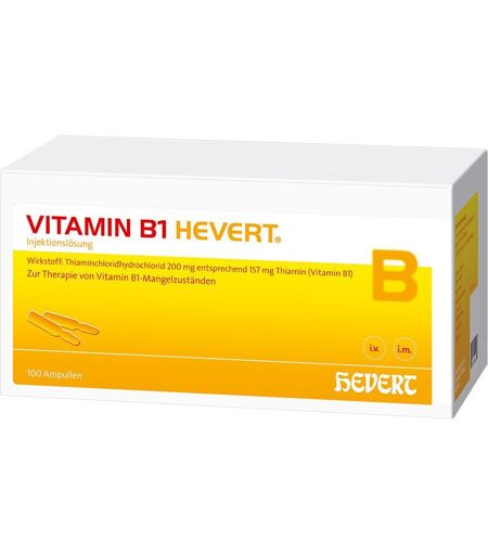 Bei ausgeprägtem Vitamin B1-Mangel Zur tiefen intramuskulären Injektion Zusammensetzung: 1 Ampulle zu 2 ml enthält: Thiaminchloridhydrochlorid (Vitamin B1) 200 mg Sonstige Bestandteile: Natriumhydroxidlösung, Wasser für Injektionszwecke. Anwendungsgebiete: Zur Anfangsbehandlung schwerer Formen der Wernicke-Enzephalopathie (eine durch Vitamin B1-Mangel bedingte Erkrankung des Gehirns) und der Beri-Beri (Vitamin B1-Mangelkrankheit). Dosierung: Zur anfänglichen Vitamin B1-Therapie werden täglich eine halbe bis 1 Ampulle Vitamin B1-Hevert (entsprechend 100-200 mg Thiaminchloridhydrochlorid) vorsichtig und langsam tief intramuskulär injiziert. Zur Weiterbehandlung nach Abklingen der akuten Beschwerden stehen Präparate mit einer niedrigeren Wirkstoffdosis zur Verfügung. Gegenanzeigen: Vitamin B1-Hevert darf nicht angewendet werden bei Verdacht auf Überempfindlichkeit gegen Vitamin B1. Schwangerschaft und Stillzeit: In der Schwangerschaft und Stillzeit sollte der tägliche Vitaminbedarf mit einer ausgewogenen Ernährung sichergestellt werden. Dieses Arzneimittel ist (aufgrund seiner Wirkstoffmenge) nur zur Behandlung eines Vitaminmangels bestimmt und darf daher nur nach sorgfältiger Nutzen/Risiko-Abwägung durch den Arzt angewendet werden. Systematische Untersuchungen zur Anwendung von Vitamin B1-Hevert in der Schwangerschaft liegen nicht vor. Vitamin B1 geht in die Muttermilch über. Nebenwirkungen: In Einzelfällen kann es zu Überempfindlichkeitsreaktionen kommen (Schweißausbrüche, Herzrasen, Hautreaktionen mit Juckreiz und Quaddeln). Nach einer Vitamin B1-Injektion können in Einzelfällen auch Schockzustände mit Kreislaufkollaps, Hautausschlägen oder Atemnot auftreten. Wechselwirkungen: Vitamin B1-Hevert verliert bei gleichzeitiger Gabe des Zytostatikums 5-Fluoruracil seine Wirkung. Bei Langzeitbehandlung mit dem Entwässerungsmittel Furosemid kann ein Vitamin B1-Mangel entstehen, weil vermehrt Vitamin B1 mit dem Urin ausgeschieden wird. Ein Mangel an Vitamin B1 kann zwei typische Krankheiten auslösen: Beri-Beri ist die klassische Vitamin B1-Mangelerkrankung, infolge Unterversorgung des menschlichen Körpers mit dem lebensnotwendigen Stoff. Typische Krankheitserscheinungen sind Muskelschwäche, insbesondere an den Beinen, Flüssigkeitsansammlungen im Bereich von Herz, Lunge sowie Gehirn, Herzschwäche und Herzrhythmusstörungen. Dadurch kann es zu lebensbedrohenden Zuständen kommen. Besonders heftig ist der Verlauf oftmals im Säuglings- und Kindesalter. Die Wernicke-Enzephalopathie ist eine Erkrankung, die mit Veränderungen des Hirngewebes, infolge von Vitamin B1-Mangel bei Beri-Beri oder Alkoholismus einhergeht. Seltener sind Vergiftungen oder eine bestimmte Stoffwechselkrankheit (Porphyrie) die Ursache. Typische Anzeichen dabei sind Augenmuskellähmungen, Schlafsucht, Muskelbewegungsstörungen (Ataxie), Nervenentzündungen (Polyneuritis), psychische Veränderungen (Delirium, Korsakow-Syndrom) und Hirnblutungen. In der Anfangsphase der Behandlung schwerer Formen... ...