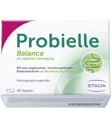 Nahrungsergänzungsmittel sind kein Ersatz für eine ausgewogene und abwechslungsreiche Ernährung und eine gesunde Lebensweise.Probielle Balance STADA®DIE DARMFLORA UNTERSTÜTZENEin natürliches Gleichgewicht der Bakterien in der Darmflora ist für den gesamten Organismus sehr wichtig. Verschiedene Faktoren stören die empfindliche Bakterienflora im Darm. Probielle® Balance enthält Lactobacillen und Bifidobakterien, diese Bakterienarten gehören zu den wichtigsten Vertretern der Darmbakterien. Milchsäurebakterien (Lactobacillen) stabilisieren das Milieu im Darm – so hemmen sie das Wachstum schädlicher Bakterien. Bifidobakterien sind ebenso wichtig, um Krankheitserreger im Verdauungssystem zu bekämpfen. Der Verzehr von einer Kapsel Probielle® Balance pro Tag sorgt dafür, dass die zwei enthaltenen Bakterienstämme den Darm erreichen, sich dort ansiedeln und vermehren. PROBIELLE® BALANCE KANN IHR GLEICHGEWICHT IM DARM UNTERSTÜTZEN GESTÖRTE DARMFLORA VERMEIDENEine gestörte Darmflora kann unangenehme Folgen haben. Auf nahezu alle Bereiche des menschlichen Organismus hat die Darmflora Einfluss. Besonders deutlich wird eine Störung aber an einem anfälligen Immunsystem. Ständige Erkältungen, Blasenentzündungen und Erschöpfung sind die Folgen. Eine Störung kann auch zu Bauchschmerzen, Völlegefühl, Verstopfung, Durchfall und Nahrungsmittelintoleranzen führen. Mit Probielle® Balance können Sie die Darmflora unterstützen, so dass diese sich regenerieren kann und solche unerwünschten Zustände gar nicht erst auftreten. Und bei einer schon gestörten Darmflora ist die Einnahme von Probielle® Balance für die Einnahme über einen längeren Zeitraum konzipiert, um das Bakteriengleichgewicht im Darm zu fördern. Die enthaltenen Milchsäurebakterien sind unempfindlich gegenüber Magensäure, so dass nach Verzehr einer Kapsel Probielle® Balance pro Tag der Darm mit wertvollen Bakterien besiedelt werden kann.TIPPS FÜR EIN NATÜRLICHES GLEICHGEWICHT DER BAKTERIEN IN DER DARMFLORAOhne Darmbakterien könnten wir nicht leben, und die Art und Anzahl der Bakterien in unserem Darm nimmt maßgeblich Einfluss auf unseren gesamten Organismus. Die Zahl der Bakterienzellen im Darm übersteigt sogar die Zahl unserer Körperzellen. Es gibt viele verschiedene Arten, die alle verschiedene Aufgaben übernehmen. Sie alle müssen in ausreichender Menge im Darm leben. Durch Stress, fehlerhafte Ernährung und Medikamenteneinnahme wird das Gleichgewicht gestört. Das hat Einfluss auf die Darmschleimhaut, welche sich entzünden kann und Erreger leichter durchlässt. Außerdem bilden Milchsäurebakterien Vitamine, die uns fehlen, wenn die Bakterien zu wenig im Darm angesiedelt sind.Zutaten:Mikrokristalline Cellulose; Hydroxypropylmethylcellulose; Lactobacillus acidophilus NCFM®; Bifidobacterium lactis HN019TM; Trennmittel: Magnesiumsalze der Speisefettsäuren, Siliciumdioxid; Farbstoff: Verzehrempfehlung:1 Kapsel pro Tag mit ausreichend Flüssigkeit bevorzugt zu einer Hauptmahlzeit zu verzehren.Hinweis:Die angegebene... ...