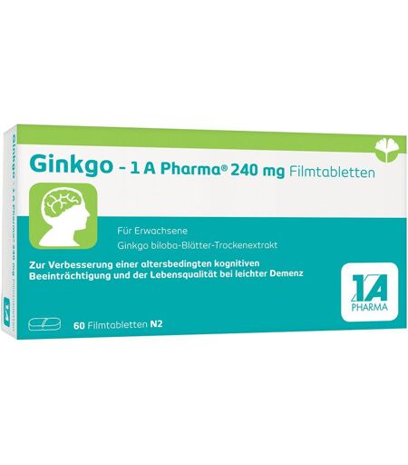 Ginkgo– 1 A Pharma® 240 mg mit einem Extrakt aus Ginkgo-Blättern Pflanzliches Arzneimittel zur Verbesserung einer altersbedingten kognitiven Beeinträchtigung bei leichter Demenz Zur Verbesserung der Lebensqualität bei leichter Demenz Wirkt durch Ginkgo-biloba-Blätter-Trockenextrakt mit Verbesserung der Durchblutung Für Erwachsene ab 18 Jahren 1 A Pharma. 1 A Preise. 1 A Entscheidung! Ginkgo: Natürliche Gedächtnisstärkung Die Inhaltsstoffe des Trockenextraktes aus den Ginkgo-Blättern zeichnen sich durch ihre durchblutungsfördernde Wirkung aus. Der in Ginkgo – 1 A Pharma® enthaltene Trockenextrakt setzt sich aus Pflanzeninhaltsstoffen wie Ginkgoliden, Bilobalid und Flavonoiden zusammen. Diese fördern die Aktivität der Botenstoffe im Gehirn und sorgen für eine verbesserte Informationsübertragung zwischen den Nervenzellen. Gut zu wissen: Ginkgo – 1 A Pharma® 240 mg Filmtabletten gibt es auch niedriger dosiert als Ginkgo biloba – 1 A Pharma® 120 mg Filmtabletten. Geistige Leistungsfähigkeit im Alter verbessern* Kontinuierliches Vergessen von Tätigkeiten oder Verlegen von Gegenständen bis hin zu Konzentrationsschwierigkeiten im Alter können Hinweise auf eine leichte Demenz sein. Wenn die geistige Leistungsfähigkeit mit zunehmendem Alter nachlässt*, kann das pflanzliche Arzneimittel Ginkgo – 1 A Pharma® 240 mg helfen. Funktionsstörungen der Hirnleistung können den Alltag zur Herausforderung machen und dadurch die Lebensqualität stark einschränken. Konzentrationsschwierigkeiten, eingeschränkte Denkfähigkeit oder verstärkt auftretende Gedächtnisstörungen, sollten ernst genommen werden. Ginkgo – 1 A Pharma® 240 mg kann unterstützen, die Durchblutung im Gehirn zu fördern und die Lebensqualität bei leichter Demenz zu stärken. Ginkgo – 1 A Pharma® 240 mg Filmtabletten enthalten einen Trockenextrakt aus Ginkgo-Biloba-Blättern, welcher für seine durchblutungsfördernden Eigenschaften bekannt ist. So kann der Extrakt die Leistungsfähigkeit des Gehirns positiv beeinflussen. * bei leichter Demenz Anwendungsempfehlung Ginkgo – 1 A Pharma® 240 mg eignet sich zur Anwendung bei Erwachsenen ab 18 Jahren. Erwachsene nehmen 2-mal täglich eine halbe (½) Filmtablette Ginkgo – 1 A Pharma® 240 mg ein. Die Einnahme sollte morgens und abends erfolgen. Die Tabletten sollten (nicht zerkaut) mit Flüssigkeit, am besten mit einem Glas Trinkwasser, geschluckt werden. Die Einnahme kann unabhängig von den Mahlzeiten erfolgen. Die Behandlung sollte mindestens 8 Wochen betragen. Wenn nach 3 Monaten keine Besserung der Symptome eingetreten ist oder sich die Krankheitssymptome verstärken, ist vom Arzt zu überprüfen, ob die Weiterführung der Behandlung noch gerechtfertigt ist. Bitte lesen Sie dazu auch die Packungsbeilage und fragen Sie Ihren Arzt oder Apotheker. Alltagsschwierigkeiten Demenzerkrankungen äußern sich durch Störungen in der Hirnleistung. Hierunter leiden das Gedächtnis und die Konzentrationsfähigkeit. Leichte Demenz ist das Anfangsstadium eines altersbedingten... ...