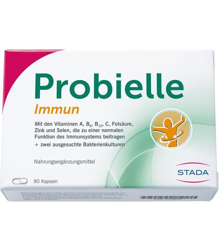 Nahrungsergänzungsmittel sind kein Ersatz für eine abwechslungsreiche und ausgewogene Ernährung und eine gesunde Lebensweise.Probielle Immun Kapseln DIE DARMFLORA UNTERSTÜTZEN Ein natürliches Gleichgewicht der Bakterien in der Darmflora ist für den gesamten Organismus sehr wichtig – besonders für das Immunsystem. Denn über 80% der Immunzellen befinden sich im Darm und profitieren von einer ausgeglichenen Darmflora. Bei einer gestörten Zusammensetzung der Darmbakterien kann ein geschwächtes Immunsystem die Folge sein. Probielle® Immun ist ein qualitativ hochwertiges Nahrungsergänzungsmittel zur Unterstützung der Immunabwehr. Es enthält die Vitamine A, B6, B12, C und Folsäure sowie die Mineralstoffe Zink und Selen. Außerdem beinhaltet es 2 Stämme mit 1,2 Milliarden ausgesuchten, gegen Magensaft unempfindliche Milchsäurebakterien pro Kapsel. Probielle® Immun enthält Lactobacillen, diese Bakterienarten gehören zu wichtigen Vertretern der Darmbakterien. Milchsäurebakterien (Lactobacillen) stabilisieren das Milieu im Darm – so hemmen sie das Wachstum schädlicher Bakterien. PROBIELLE® IMMUN KANN IHR IMMUNSYSTEM UNTERSTÜTZENMÖGLICHE FOLGEN EINER GESTÖRTEN DARMFLORAEine gestörte Darmflora kann unangenehme Folgen haben. Auf nahezu alle Bereiche des menschlichen Organismus hat die Darmflora Einfluss. Besonders deutlich wird eine Störung aber an einem anfälligen Immunsystem. Ständige Erkältungen, Blasenentzündungen oder Erschöpfung können die Folgen sein. Probielle® Immun - mit 2 ausgesuchten Bakterienstämmen und wertvollen Mikronährstoffen - trägt zu einer normalen Funktion des Immunsystems bei. Es wird täglich 1 Kapsel mit ausreichend Flüssigkeit eingenommen.TIPPS FÜR EIN STARKES IMMUNSYSTEMUm ständig wiederkehrenden Infekten oder Allergien vorzubeugen, ist es hilfreich Stress zu reduzieren. Körperliche Aktivität hilft dabei, Stress auszugleichen und kurbelt den Stoffwechsel an. Achten Sie auf ausreichend Schlaf. Durch eine ausgewogene Ernährung versorgen Sie Ihren Körper mit lebenswichtigen Vitaminen und Mineralstoffen, die für eine normale Funktion des Immunsystems benötigt werden. Zusätzlich können Sie Ihr Immunsystem stärken, indem Sie die Darmfunktion unterstützen. Probielle® Immun enthält eine ausgewogene Kombination aus 2 Stämmen Lactobacillen sowie immunstärkenden Vitaminen und Mineralstoffen. Der Verzehr von 1 Kapsel Probielle® Immun pro Tag kann Ihre Abwehr stärken.Zutaten:Maltodextrin; Hydroxypropylmethylcellulose; Lactobacillus plantarum CECT 7315; Lactobacillus plantarum CECT 7316; L-Ascorbinsäure (Vitamin C); Zinksulfat; Trennmittel: Talkum, Siliciumdioxid; Retinylacetat (Vitamin A); Farbstoff: ; Pyridoxinhydrochlorid (Vitamin B6); Pteroylmonoglutaminsäure (Folsäure); Natriumselenit; Cyanocobalamin (Vitamin B12). Zusammensetzung Pro Kapsel Vitamin C 40 mg Zink 5,0 mg Vitamin B6 0,70 mg Vitamin A 400 µg RE Folsäure (Vitamin B9) 100 µg Vitamin B12 1,3 µg Selen 30 µg Bakterienkulturen (Lactobacillus plantarum CECT 7315, Lactobacillus plantarum... ...
