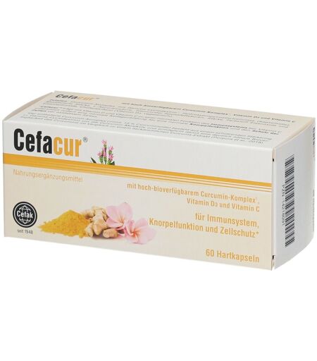 Nahrungsergänzungsmittel sind kein Ersatz für eine ausgewogene und abwechslungsreiche Ernährung und eine gesunde Lebensweise.Der enthaltene Curcumin-Komplex besteht aus einem schützenden Stärkering (= Gamma-Cyclodextrin) um die Curcumin-Moleküle und ermöglicht damit eine deutlich bessere Bioverfügbarkeit des Curcumins im Vergleich zu einem herkömmlichen Curcuma-Extrakt.Zutaten:Curcumin-Komplex (aus Curcuma-Extrakt und Gamma-Cyclodextrin, mind. 15% Curcuminoide), Hydroxypropylmethylcellulose (Kapselhülle), Modifizierte Stärke (Mais), LAscorbinsäure (Vitamin C), Trennmittel Speisefettsäuren, Cholecalciferol (Vitamin D3), Stärke (Mais),Farbstoff Eisenoxide und Eisenhydroxide.gluten- und laktosefrei.Nährwerte: Nährwerte pro 2 Kapseln Curcumin-Komplex 540 mg Vitamin D 13,3 µg Vitamin C 13,3 mg Verzehrempfehlung:Erwachsene 2-3 Kapseln pro Tag. Die Kapseln unzerkaut zu einer Mahlzeit mit ausreichend Flüssigkeit einnehmen.Hinweis:Die angegebene empfohlene tägliche Verzehrmenge darf nicht überschritten werden.Aufbewahrung:Kühl (6-25 °C) und lichtgeschützt lagern. Außerhalb der Reichweite von kleinen Kindern aufbewahren.Nettofüllmenge: 60 Kapseln = 25,6 gHerstellerdaten: Cefak KG Ostbahnhofstr. 15D-87437 Kempten ...