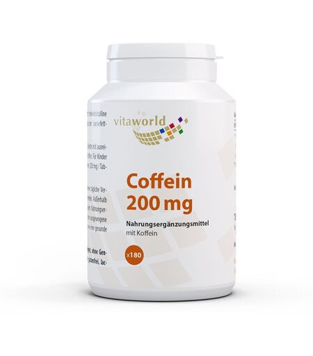 Nahrungsergänzungsmittel sind kein Ersatz für eine abwechslungsreiche und ausgewogene Ernährung und eine gesunde Lebensweise.VitaWorld Coffein 200 mg Hochdosiertes Koffein mit 200 mg pro Tablette Die Alternative zu Kaffee, Tee und Energydrinks Vegane Tabletten Zutaten:Koffein wasserfrei, Füllstoff: mikrokristalline Cellulose, Trennmittel: Magnesiumsalze der Speisefettsäuren Nährstoffe Pro Tablette Koffein 200 mg Glutenfrei, lactosefrei, ohne künstliche Aromen, ohne Gentechnik, für Vegetarier und Veganer geeignetVerzehrempfehlung: Täglich 1 Tablette mit ausreichend Flüssigkeit verzehren.Aufbewahrung: Die Dose nach Gebrauch gut verschlossen halten. Kühl, nicht über 25 Grad und trocken lagern.Hinweis: Enthält Koffein (200 mg pro Tablette). Für Kinder und schwangere Frauen nicht empfohlen.Nettofüllmenge: 180 Tabletten 63 gHerstellerdaten: Vita-World GmbH Kurt-Schumacher-Str. 49 65232 Taunusstein ...
