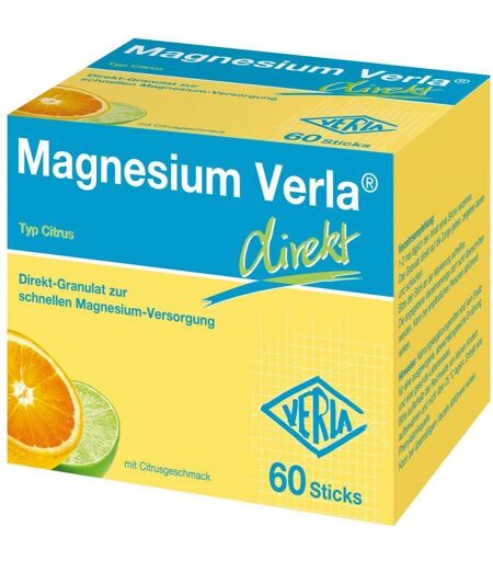 Nahrungsergänzungsmittel sind kein Ersatz für eine abwechslungsreiche und ausgewogene Ernährung und eine gesunde Lebensweise.Magnesium Verla® Direkt CitrusMagnesium Verla® direkt ist ein Nahrungsergänzugnsmittel zur schnellen Versorgung mit Magnesium. Das praktische Direkt-Granulat wird ohne Flüssigkeit eingenommen.Zutaten:Magnesiumcitrat (75 %), Süßungsmittel Sorbit, Säuerungsmittel Zitronensäure, natürliches Orangen-Aroma, natürliches Zitronen-Aroma, Verdickungsmittel Natrium-Carboxymethylcellulose, Cellulosegummi, Süßungsmittel Aspartam, Trennmittel (Talkum, Magnesiumsalze der Speisefettsäuren)Nährwerte: Nährwertangaben pro 100 g pro 1 Beutel Brennwert / Energie kJ kcal kJ kcal - - - - Fett [g] - - - davon gesättigte Fettsäuren [g] - - Kohlenhydrate [g] - - - davon Zucker - - Ballaststoffe [g] - - Eiweiß [g] - - Salz [g] - - Vitamine/Mineralstoffe pro 100 g %* pro Portion %* Vitamin A [µg] - - - - Vitamin D [µg] - - - - Vitamin E [mg] - - - - Vitamin K [µg] - - - - Vitamin C [mg] - - - - Thiamin (Vitamin B1) [mg] - - - - Riboflavin (Vitamin B2) [mg] - - - - Niacin [mg NE] - - - - Vitamin B6 [mg] - - - - Folsäure [µg] - - - - Vitamin B12 [µg] - - - - Biotin [µg] - - - - Pantothensäure [mg] - - - - Kalium [mg] - - - - Chlor [mg] - - - - Calcium [mg] - - - - Phosphor [mg] - - - - Magnesium [mg] - - 150 40 Eisen [mg] - - - - Zink [mg] - - - - Kupfer [mg] - - - - Mangan [mg] - - - - Fluor [mg] - - - - Selen [µg] - - - - Chrom [µg] - - - - Molybdän [µg] - - - - Jod [µg] - - - - *% Prozent der Referenzmenge gemäß VO (EU) Nr. 1169/2011Verzehrempfehlung: 1 mal täglich den Inhalt eines Sticks verzehren. Das Granulat direkt auf die Zunge geben, zergehen lassen und schlucken. Bitte den Stick an der Markierung aufreißen.Hinweis: Kann bei übermäßigem Verzehr abführend wirken.Aufbewahrung: Bitte außerhalb der Reichweite von kleinen Kindern aufbewahren und nicht über 25°C lagern.Nettofüllmenge: 60 Sticks à 1,66 g = 99,6 gHerstellerdaten: Verla-Pharm Arzneimittel 82324 Tutzing ...