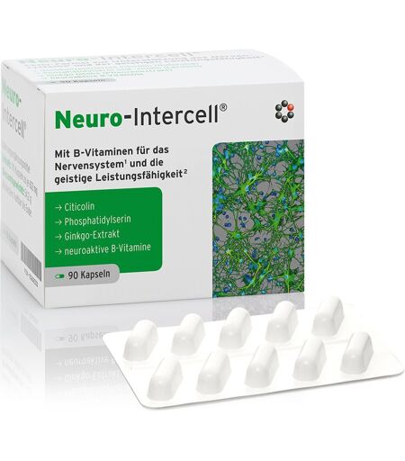 Nahrungsergänzungsmittel sind kein Ersatz für eine abwechslungsreiche und ausgewogene Ernährung und eine gesunde Lebensweise. Neuro-Intercell® Mit B-Vitaminen für das Nervensystem und die geistige Leistungsfähigkeit. Zutaten: Citicolin (Cognizin•)*, Lecithin-Komplex aus Sonnenblumen, pflanzliche Kapsel aus Hydroxypropylmethylcellulose (HPMC), Cholinbitartrat, Ginkgoblätterextrakt, Calcium-D-Pantothenat, Thiaminhydrochlorid (Vitamin Bi), Pyridoxinhydrochlorid (Vitamin B6), Trennmittel Magnesiumsalze der Speisefettsäuren, Folsäure, Methylcobalamin (Vitamin B12). (*Cognizin• is a registered trademark of KYOWA HAKKO BIO CO., LTD.) Zusammensetzung pro Kapsel pro 2 Kapseln Citicolin 250 mg 500 mg Phosphatidylserin 100 mg 200 mg Cholin 30 mg 60 mg Ginkgoblätterextrakt 25 mg 50 mg Pantothensäure 12 mg 24 mg Vitamin B1 5 mg 10 mg Vitamin B6 5 mg 10 mg Folsäure 200 µg 400 µg Vitamin B12 75 µg 150 µg Verzehrempfehlung: 1 x tgl. 1-2 Kapseln am besten vormittags mit ausreichend Flüssigkeit zu einer Mahlzeit. Hinweis: Die angegebene empfohlene Tagesmenge darf nicht überschritten werden. Aufbewahrung: Kühl (6-25 °C) und lichtgeschützt lagern. Außerhalb der Reichweite von kleinen Kindern aufbewahren. Nettofüllmenge: 90 Kapseln à 620 mg = 55,8 g Herstellerdaten: lntercell Pharma GmbH Altlaufstr. 42 85635 Höhenkirchen ...