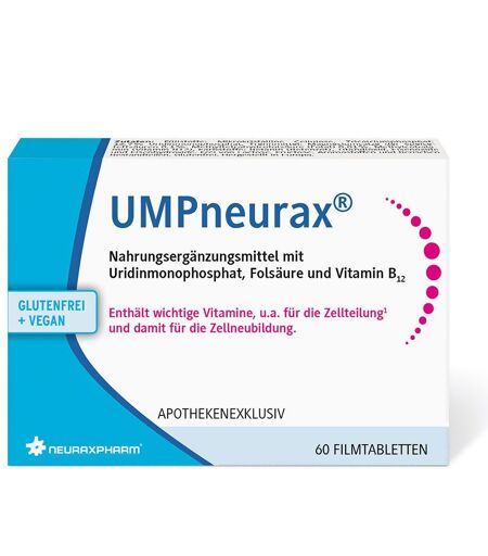Nahrungsergänzungsmittel sind kein Ersatz für eine ausgewogene und abwechslungsreiche Ernährung als Teil eines aktiven und gesunden Lebensstils.UMPneurax® – 3-fach gut für die Nerven1,2 UMPneurax® ist ein Nahrungsergänzungsmittel mit Uridinmonophosphat, Folsäure und Vitamin B12, zur dauerhaften Unterstützung des Nervensystems. Nerven können verletzt werden, zum Beispiel durch übermäßige Druckeinwirkung (bei einem Unfall oder während einer Operation) oder als Folge orthopädischer Erkrankungen (zum Beispiel eines Bandscheibenvorfalls). Zu den häufigsten Ursachen dieser Nervenschädigung gehören auch Diabetes mellitus und Alkoholmissbrauch.Die Symptome von Nervenschädigung sind vielfältig, meistens klagen die Betroffenen jedoch über Missempfindungen und/oder Schmerzen. Unterstützend zu der Vermeidung der Auslösung der Nervenschädigung, wie z. B. Schadstoffe, Alkohol oder Nikotin und einer möglichen Physiotherapie, empfiehlt sich auch die Unterstützung der Autoregeneration der Nervenzellen.Durch die einmal tägliche Einnahme von UMPneurax® kann man den Reparaturprozess der Nerven unterstützen. Der Hauptinhaltsstoff Uridinmonophosphat kann die Produktion von Proteinen fördern und somit u.a. für eine ausreichende Ausstattung mit Enzymen sorgen. Zudem stimuliert es die Synthese wichtiger Membranbestandteile und fördert somit die Zellneubildung.Folsäure ist bereits in ihrer bioaktiven Form – Methylfolat – in UMPneurax® enthalten und für die Zellteilungsprozesse sowie für die Zellneubildung von Bedeutung. Das enthaltene Vitamin B12 spielt eine wichtige Rolle für das Nerven und Immunsystem, denn es ist unter anderem an der Biosynthese von Purin und Pyrimidin basen beteiligt sowie an der Bildung der Myelinscheiden im Nervensystem.Eine Langzeitanwendung ist unbedenklich und einfach: Nehmen Sie täglich nur 1 Filmtablette ein und unterstützen Sie Ihr Nervensystem auf natürliche Weise.1 B12: Trägt zu einer normalen psychischen Funktion und normalen Funktion des Nervensystems bei. 2 Folsäure: Hat eine Funktion bei der Zellteilung. Zutaten: Füllstoffe: Mikrokristalline Cellulose, Tricalciumphosphat; 16,7% Uridinmonophosphat, Trennmittel: Magnesiumsalze der Speisefettsäuren; 0,1% Methyltetrahydrofolsäure (Folat); 0,01% Methylcobalamin (Vitamin B12), Farbstoffe: Betanin (Betenrot), , Eisenoxide und Eisenhydroxide. Frei von Lactose, Fructose, Aromastoffen und tierischen Bestandteilen. Glutenfrei. Hergestellt in Europa.Nährwerte:Durchschnittliche Nährwerte:pro Filmtablette% NRV*Uridinmonophosphat50 mg Folsäure (Methyl-Folat)400 µg 200Vitamin B12 (Methyl-Cobalamin)30 µg 1200Verzehrempfehlung:Nehmen Sie eine Filmtablette pro Tag mit ausreichend Flüssigkeit ein. Hinweis:Die angegebene empfohlene tägliche Verzehrmenge darf nicht überschritten werden.Aufbewahrung:Kühl (6-25 °C) und lichtgeschützt lagern. Außerhalb der Reichweite von kleinen Kindern aufbewahren.Nettofüllmenge: 60 FilmtablettenHersteller:neurexapharm Arzneimittel... ...
