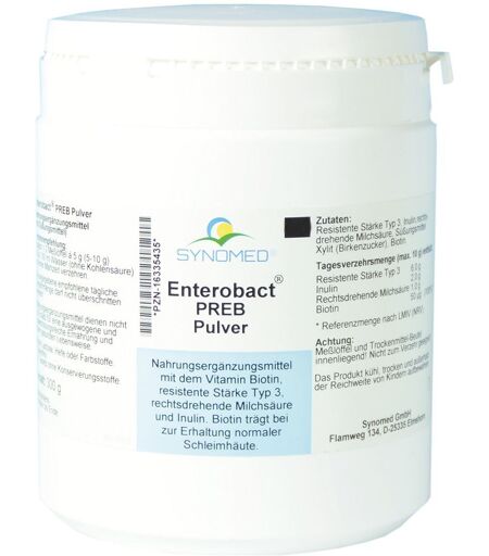 Nahrungsergänzungsmittel sind kein Ersatz für eine ausgewogene, abwechslungsreiche Ernährung und eine gesunde Lebensweise.Nahrungsergänzungsmittel mit dem Vitamin Biotin, resistente Stärke Typ 3, rechtsdrehende Milchsäure und Inulin. Biotin trägt bei zur Erhaltung normaler Schleimhäute.Zutaten:Resistente Stärke Typ3, Inulin, rechtsdrehende Milchsäure, Süßungsmittel Xylit (Birkenzucker), Biotin.Nährwerte:Tagesverzehrsmenge (max. 10g) enthält:Resistente Stärke Typ 36,0 gInulin2,0 gRechtsdrehende Milchsäure1,0 gBiotin50 µg (100 %)** Referenzmenge nach LMIV (NRV)Verzehrempfehlung:Täglich 1-2 Meßlöffel á 5g (5-10g) in ca. 150ml Wasser (ohne Kohlensäure) vor einer Mahlzeit verzehren.Hinweis:Die angegebene empfohlene tägliche Verzehrmenge darf nicht überschritten werden.Ohne Lactose, Hefe oder Farbstoffe. Glutenfrei. Lt. Gesetz ohne Konservierungsstoffe. Lagerung:Außerhalb der Reichweite von kleinen Kindern lagern.Nettofüllmenge:100 g PulverHersteller:Synomed GmbHFlamweg 132-13425335 Elmshorn ...