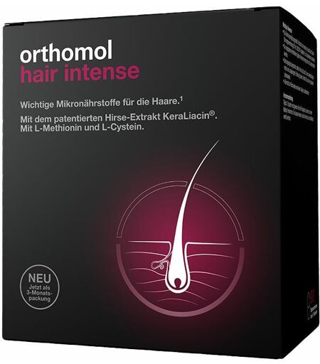 Nahrungsergänzungsmittel sind kein Ersatz eine ausgewogene und abwechslungsreiche Ernährung als Teil eines aktiven und gesunden Lebensstils. Orthomol Hair Intense Mit Orthomol Hair Intense versorgst Du Deine Haare mit wichtigen Nährstoffen: wertvolle Mikronährstoffe und B-Vitamine werden mit den Aminosäuren L-Cystein und L-Methionin sowie dem patentierten KeraLiacin® kombiniert. Mit nur 2 Kapseln täglich, kannst du die Mikronährstoffversorgung Deiner Haare sichern. Überzeuge Dich selbst – denn schönes Haar muss kein Zufall sein. Deine Haare – intensiviere ihre Schönheit Schöne und glänzende Haare sind nicht selbstverständlich. Verschiedene innere und äußere Einflüsse können die Haare im Laufe des Lebens beeinflussen. Neben der Pflege von außen ist es daher umso wichtiger, die Haare auch von innen mit den erforderlichen Nährstoffen zu versorgen und sie so zu unterstützen. Schöne Haare müssen kein Zufall sein und ausgewogene Mikronährstoffkombinationen können die Schönheit der Haare unterstützen – Tag für Tag. KeraLiacin® – der patentierte Komplex für schönes Haar Ausschließlich in der Rispenhirse befindet sich der natürliche Inhaltsstoff Miliacin. Durch eine spezielle Verkapselung mit polaren Lipiden ist es Wissenschaftlern gelungen, eine verbesserte Aufnahme im Organismus zu erreichen. Nur Orthomol Hair Intense enthält das patentierte KeraLiacin®. Weitere Inhaltsstoffe – für schönes Haar Biotin, Zink und Selen tragen zur Erhaltung normaler Haare bei Kupfer trägt zur normalen Haarpigmentierung bei Zink, Selen und Kupfer tragen dazu bei, die Zellen vor oxidativem Stress zu schützen Thiamin (Vitamin B1), Vitamin B6, Vitamin B12, Biotin, Pantothensäure und Kupfer tragen zu einem normalen Energiestoffwechsel bei Vitamin B6 trägt zu einer normalen Cystein-Synthese bei Panthotensäure trägt zur normalen Synthese und zum normalen Stoffwechsel von Steroidhormonen, Vitamin D und einigen Neurotransmittern bei. Haarwachstum – eine runde Sache Jedes gesunde Haar weist einen charakteristischen Wachstumszyklus auf, der aus drei aufeinanderfolgenden Phasen besteht: die Wachstumsphase (anagene Phase), die Übergangsphase (katagene Phase) und die Ruhephase (telogene Phase). Anschließend beginnt der Zyklus mit dem Aufbau eines Haares aufs Neue. Für diese Glanzleistung muss die Haarwurzel besonders sorgsam mit Nährstoffen versorgt werden. Veränderter Haarzyklus – beeinträchtigtes Wachstum Der Wachstumszyklus des Haares kann durch eine Reihe unterschiedlichen Faktoren beeinträchtigt werden, z.B. durch Stress, ernährungsbedingte Defizite, hormonelle Einflüsse, zunehmendes Alter oder Luftschadstoffe. So zeigt sich Ihr Haar von seiner schönsten Seite Schönes Haar sieht nicht nur gut aus, sondern fühlt sich auch gut an. Neben der richtigen Pflege können ausgewogene Mikronährstoffkombinationen das Haar gezielt von innen unterstützten und dort ansetzen, wo Pflegeprodukte aufhören. Strahlend schönes Haar muss kein Zufall sein. *Mit Selen, Biotin und Zink als Beitrag zum... ...