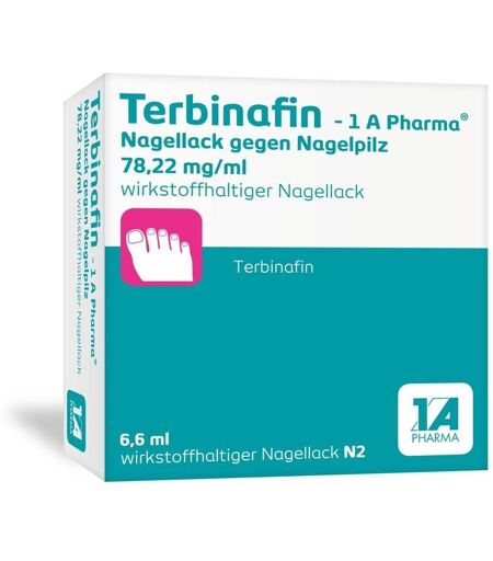 Terbinafin – 1 A Pharma® Nagellack gegen Nagelpilz (farblos) Einfache Anwendung mit Applikator Trocknet schnell in 30 Sekunden Leichtes Entfernen – ohne Lösungsmittel oder Abfeilen Rezeptfrei in Ihrer Apotheke Einfache Hilfe für leichte bis mittelschwere Formen von Nagelpilz Nagelpilz, in der Medizin als Onychomykose bezeichnet, ist eine weit verbreitete Erkrankung. Etwa jeder achte Erwachsene leidet an einer Infektion der Nägel, die in den meisten Fällen durch Fadenpilze hervorgerufen werden. Betroffen sind vor allem die Fußnägel. Eine Pilzinfektion kann jedoch auch an den Fingernägeln auftreten. Um ein Ausbreiten des Nagelpilzes zu verhindern, sollte die Infektion möglichst schon im Anfangsstadium behandelt werden. Terbinafin – 1 A Pharma® Nagellack gegen Nagelpilz eignet sich zur äußerlichen Behandlung bei leichten bis mittelschweren Pilzinfektionen der Fuß- und Fingernägel. Die Anwendung ist unkompliziert: Der Direkt-Applikator vereinfacht das großflächige Auftragen auf betroffene Nägel und umliegende Hautstellen. Bereits nach 30 Sekunden ist der Terbinafin Nagellack getrocknet. Zum Entfernen von Lackresten genügt klares Wasser, aufwändiges Abfeilen des Nagellacks oder die Verwendung von Lösungsmitteln sind nicht notwendig. Der 1. Nagellack gegen Nagelpilz* mit dem bewährten Wirkstoff Terbinafin Terbinafin – 1 A Pharma® Nagellack gegen Nagelpilz enthält den Wirkstoff Terbinafin, der zu den sogenannten Antimykotika gehört. Terbinafin ist ein bewährter Wirkstoff bei Pilzinfektionen. Terbinafin tötet eine Vielzahl von Pilzen ab, die Nagelinfektionen an Finger- oder Zehennägeln verursachen können. Mit Terbinafin – 1 A Pharma® steht ein wirkstoffhaltiger Nagellack zur Verfügung, der leichte bis mittelschwere Formen von Nagelpilz bekämpft und gleichzeitig durch seine einfache Anwendung überzeugt. Die besondere, patentierte Formulierung hilft dem Wirkstoff Terbinafin gut in das Keratin des Nagels einzudringen. Keratin sorgt dafür, dass unsere Finger-und Fußnägel fest und stark sind. Terbinafin dringt so entsprechend tief in den Nagel ein und kann dort den Nagelpilz gezielt bekämpfen! In der 4-wöchigen Anfangsphase wird Terbinafin Nagellack 1 x täglich aufgetragen, in der anschließenden Langzeitphase ist eine 1 x wöchentliche Anwendung ausreichend. *für leichte bis mittelschwere Pilzinfektionen der Nägel. Wie kann ich den Terbinafin Nagellack anwenden? Schritt 1: Reinigen Sie die betroffenen Stellen an den Nägeln sowie die angrenzenden Hautstellen gründlich und lassen sie trocknen. Schritt 2: Tragen Sie eine dünne Schicht Terbinafin - 1 A Pharma® Nagellack auf die betroffenen Nägel, die angrenzenden Hautpartien sowie die Haut unter dem Nagel auf – idealerweise vor dem Zubettgehen. Schritt 3: Warten Sie etwa 30 Sekunden, bis der Lack vollständig getrocknet ist, ehe Sie andere Aktivitäten aufnehmen. Die behandelten Nägel dürfen mindestens 6 Stunden nicht gewaschen oder nass werden. Schritt 4: Terbinafin – 1 A Pharma® Nagellack kann einfach durch... ...