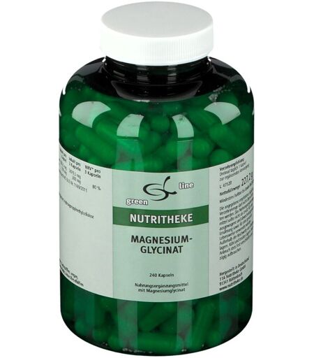 Nahrungsergänzungsmittel sind kein Ersatz für eine abwechslungsreiche und ausgewogene Ernährung und eine gesunde Lebensweise.Magnesiumglycinatgreen line Magnesiumglycinat enthält 826,5 mg Magnesiumglycinat pro Kapsel, was 100 mg Magnesium pro Kapsel entspricht. Das Magnesium ist an die Aminosäure L-Glycin gebunden, die eine entscheidende Rolle im zentralen Nervensystem spielt. Magnesium trägt u.a. zur Verringerung von Müdigkeit, zu einem normalen Energiestoffwechsel, zu einer normalen Funktion des Nervensystems sowie zur Erhaltung normaler Knochen und Muskelfunktion bei. Besonders bei Überanstrengung und stressgeplagten Menschen kann eine Ergänzung sinnvoll sein. Unser Produkt Magnesiumglycinat wird unter Einhaltung der höchsten Standards in Deutschland hergestellt. Für uns ist es selbstverständlich, dass in green line Magnesiumglycinat nur hochreine und geprüfte Rohstoffe (Reinsubstanzen) enthalten sind. Green line aus der 11A Nutritheke bietet Ihnen die größte Auswahl an Mikronährstoffen und Spurenelementen zu absolut fairen Preisen. Mit jedem green line Produkt erhalten Sie Top-Qualität bei gleichzeitigem Verzicht auf chemische Zusatzstoffe und Rieselhilfen. Die grüne Linie der Natur soll Ihren Körper in jeder Lebenslage unterstützen, aufbauen und Energie schenken. Denn green line bietet Ihnen für jede Situation das richtige Produkt und das MADE IN GERMANY.Eigenschaften:lactosefrei, glutenfrei, gelatinefrei, farbstofffrei, vegan, pflanzliche Kapselhülle, ohne Gentechnik, keine RieselhilfenZutaten:Magnesiumbisglycinat, Hydroxypropylmethylcellulose (Kapselhülle)Inhaltsstoffe:Inhalt pro Kapsel: Magnesiumbisglycinat: 826,5 mg enthält Magnesium: 100 mgVerzehrempfehlung:Dreimal täglich 1 Kapsel zur ergänzenden VersorgungHinweis:Die angegebene empfohlene tägliche Verzehrsmenge darf nicht überschritten werden.Aufbewahrung:Außerhalb der Reichweite von Kindern lagern. Kühl und trocken lagern.Nach Anbruch stets fest verschließen und zügig aufbrauchen.Nettofüllmenge:240 StückHersteller: 11A Nutritheke GmbH Hauptstraße 3a91341 Röttenbach ...