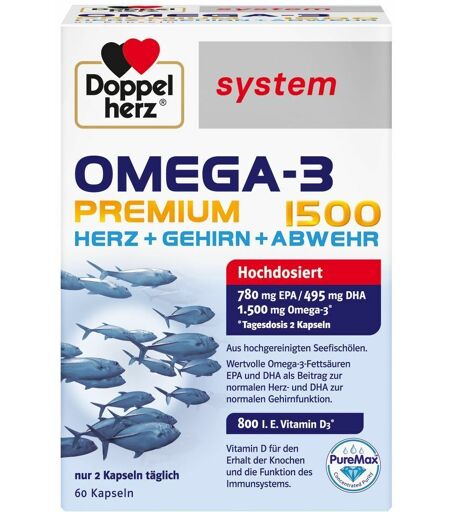 Nahrungsergänzungsmittel sind kein Ersatz für eine ausgewogene und abwechslungsreiche Ernährung und eine gesunde Lebensweise.Doppelherz® system Omega-3 Premium 1500 Hochgereinigte Omega-3-Fettsäuren aus Seefischölen Hochdosiert: 780 mg EPA und 495 mg DHA (bei 2 Kapseln täglich) In Triglycerid-Qualität und aus nachhaltiger FischereiDoppelherz system OMEGA-3 PREMIUM 1500 Kapseln enthalten ein hochgereinigtes Konzentrat aus Seefischölen mit den wertvollen Omega-3-Fettsäuren EPA und DHA in Kombination mit Vitamin D3 und E. Durch die hohe Konzentration an Omega-3-Fettsäuren liefern bereits zwei Kapseln täglich 1.500 mg Omega-3-Fettsäuren, davon 780 mg EPA und 495 mg DHA. Dadurch kann auch bei einem erhöhten Bedarf eine gute Versorgung mit den wertvollen Omega-3-Fettsäuren unterstützt werden. Omega-3-Fettsäuren sind ein wichtiger Bestandteil einer gesunden Ernährung. Dennoch ist die Versorgung mit diesen langkettigen mehrfach ungesättigten Fettsäuren nicht bei allen Menschen optimal. Die Omega-3-Fettsäuren EPA und DHA tragen bei einer täglichen Aufnahme von 250 mg zur normalen Herzfunktion bei. DHA leistet bei einer Aufnahme von 250 mg täglich zudem auch einen Beitrag zum Erhalt einer normalen Gehirnfunktion sowie zum Erhalt der normalen Sehkraft. Vitamin D trägt zum normalen Knochenerhalt und zur normalen Muskelfunktion bei. Darüber hinaus leistet es einen Beitrag für die normale Funktion des Immunsystems. Eine Tagesportion (2 Kapseln) enthält 20 μg Vitamin D in Form von Vitamin D3. Dies entspricht 800 I.E. (internationale Einheiten) Vitamin D3. Das zusätzlich enthaltene fettlösliche Vitamin E leistet einen Beitrag zum Schutz der Zellen vor oxidativem Stress. Doppelherz system OMEGA-3 PREMIUM 1500 Kapseln enthalten ein hochgereinigtes Konzentrat aus Seefischölen, sind geschmacks- und geruchsneutral und enthalten keine Farbstoffe. Zur Omega-3 Konzentrat-Gewinnung werden nur Fische verwendet, die aus nachhaltiger Fischerei stammen.Zutaten:Omega-3-Fettsäuren-haltiges Konzentrat aus Seefischölen, Gelatine (Rind), Feuchthaltemittel Glycerin, Feuchthaltemittel Sorbit, D-alpha-Tocopherol, Cholecalciferol Nährwerte: Zusammensetzung pro Kapsel pro Tagesportion (=2 Kapseln) % NRV Omega-3-Konzentrat aus Seefischölen 883 mg 1.766 mg ** darin Omega-3-Fettsäuren davon insgesamt 750 mg 1.500 mg ** Eicosapentaensäure (EPA) 390 mg 780 mg ** Docosahexaensäure (DHA) 247,5 mg 496 mg Vitamin D 10 µg 20 µg Vitamin E 6 mg -TE 12 mg -TE ** * Nährstoffbezugswerte gemäß EU-Verordnung 1169/2011 (bezogen auf 2 Kapseln)** keine Nährstoffbezugswerte vorhandenVerzehrempfehlung:Täglich 2 Kapseln mit etwas Flüssigkeit zu einer Mahlzeit (z. B. zum Mittag essen oder Frühstück) unzerkaut ein nehmen.Hinweise:Die angegebene empfohlene tägliche Verzehrmenge darf nicht überschritten werden.Für Kinder, Jugendliche, Schwangere und Stillende nicht geeignet.Personen, die blutverdünnende Mittel einnehmen, sollten vor Anwendung Rücksprache mit ihrem Arzt halten.Aufbewahrung:Kühl... ...