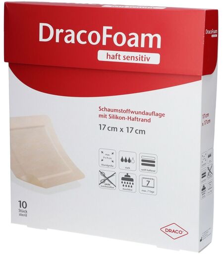 DracoFoam haft sensitiv Schaumstoffwundauflage mit Silikon-Haftrand Produktgröße: 17 x 17 cm Wundgröße: 9 x 9 cm Wundpadgröße: 11 x 11 cm DracoFoam haft sensitiv ist eine sterile hydrophile Polyurethanschaumstoffwundauflage zur Abdeckung akuter und chronischer Wunden, zur Aufnahme und Speicherung von Wundexsudat sowie zur Erhaltung eines feuchten Wundmilieus. Der flexible Polyurethan-Schaum wölbt sich in der Anwendung dem Wundgrund entgegen und besitzt ein hohes Exsudataufnahmevermögen. Das gute Exsudatmanagement ermöglicht eine lange Tragedauer und vermindert die Gefahr von Wundmazeration. Die überschüssige Flüssigkeit wird zur Polyurethan-Membran transportiert, sodass diese dort abdampfen kann. Die Polyurethan-Folie verhindert das Entweichen des Exsudats und stellt eine Barriere gegen Erreger von außen dar. Die Sensitiv-Silikon-Technologie erlaubt ein Repositionieren des Verbandes, um eine faltenfreie Applikation zu erzielen und ist zur Anwendung auf fragiler Haut geeignet. Hierbei wird die Verträglichkeit des Verbandes erhöht. Der atraumatische Verbandwechsel vermeidet Schmerzen und eine Neu-Traumatisierung der Wunde. DracoFoam haft sensitiv ist geeignet für Wunden mit hohem Exsudataufkommen, z. B. oberflächliche und tiefere akute und chronische Wunden wie Ulcus cruris (venös, arteriell), Dekubitus oder diabetisches Fußsyndrom, Spalthautentnahmestellen, postoperative Wunden und Verbrennungen bis zum 2. Grad. Die Wundauflage ist wasserabweisend, bietet einen sicheren Wäscheschutz, ist keimdicht und bietet eine hohe Atmungsaktivität bei hoher Elastizität. DracoFoam haft sensitiv kann unter ärztlicher Aufsicht bis zu 7 Tage auf der Wunde verbleiben. Das Produkt ist für stark exsudierende Wunden geeignet. Das Produkt ist haftend und es wird keine Sekundärfixierung benötigt. Das Produkt kann nicht zugeschnitten werden. Das Produkt ist zum Duschen geeignet. Je nach Wundzustand und Exsudatmenge kann das Produkt unter ärztlicher Aufsich bei nicht infizierten Wunden bis zu 7 Tage auf der Wunde verbleiben. Das Produkt ist steril. Anwendungsbereiche Dekubitus, Ulcus cruris venosum, Ulcus cruris arteriosum, Oberflächliche Wunden mit hohem Exsudataufkommen, Diabetisches Fußsyndrom, Verbrennungen bis zum 2. Grad, chronische Wunden, postoperative Wunden, tiefe Wunden, Spalthautentnahmen Wundumgebung intakt, empfindlich/fragil Wundstadium Granulation, Nekrose, Fibrinbelag Wundheilungsphase Exsudationsphase, Granulationsphase Exsudation mäßige bis starke, starke bis sehr starke Kleber Silikonkleber Material hydrophiler, absorbierender Polyurethanschaum ...