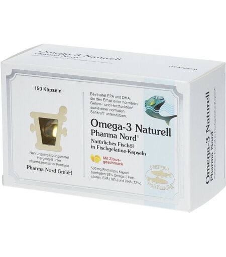Nahrungsergänzungsmittel sind kein Ersatz für eine ausgewogene und abwechslungsreiche Ernährung und eine gesunde Lebensweise.Omega-3 Naturell Pharma Nord®Omega-3-Fettsäuren gehören zur Gruppe der ungesättigten Fettsäuren und können von unserem Körper nicht selbst hergestellt werden. Deshalb müssen sie über die Nahrung zugeführt werden. Die darin enthaltenen Fettsäuren leisten einen wichtigen Beitrag zur Gesundheit: EPA und DHA unterstützten die normale Funktion des Herzmuskels DHA unterstützt den Erhalt einer normalen Gehirnfunktion DHA leistet einen Beitrag zum Erhalt der normalen SehkraftDie Omega-3 Naturell Kapseln von Pharma Nord bestehen zu 100 % aus Fischbestandteilen. Sie zeichnen sich durch Natürlichkeit, Reinheit und Sicherheit aus.Zutaten:Fischöl, Kaspelhülle: Speisegelatine aus Fisch, Feuchthaltemittel: Glycerin, Wasser, Aroma: Zitronengeschmack.Frei von Gluten und Lactose.Nährwerte: Durschnittliche Nährwerte: pro 1 Kapsel NRV%* pro 5 Kapseln NRV%* Fischöl 500 mg ** 2500 mg ** davon EPA 90 mg 450 mg ** DHA 60 mg 300 mg ** * NRV – in % des Nährstoffbezugswertes ** NRV: Nicht festgelegt Verzehrempfehlung: Täglich 5 Kapseln zu beliebigen Mahlzeiten mit etwas Flüssigkeit verzehren. Das Fischöl kann auch durch Entleeren der Kapsel mit einem Löffel eingenommen werden.Hinweis:Die angegebene empfohlene Tagesmenge darf nicht überschritten werden.Aufbewahrung:Kühl (6-25 °C) und lichtgeschützt lagern. Außerhalb der Reichweite von Kindern aufbewahren.Nettofüllmenge:150 Kapseln = 109 gHerstellerdaten:Pharma Nord GmbHSchiffbrückstraße 624937 FlensburgDeutschland ...