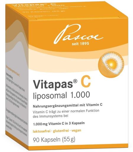 Nahrungsergänzungsmittel sind kein Ersatz für eine ausgewogene und abwechslungsreiche Ernährung und eine gesunde Lebensweise.Vitapas® C liposomal 1.000Nahrungsergänzungsmittel mit 1.000 mg Vitamin C gemeinsam mit Wissenschaftlern der Universität Marburg entwickelt Tagesverzehrsempfehlung 1.000 mg Vitamin C (3 Kapseln am Tag) für ein funktionierendes Immunsystem* schützt die Zellen vor oxidativem Stress** 90 Kapseln vegan, glutenfrei und laktosefrei in Pascoe-Qualität hergestellt * Vitamin C trägt zu einer normalen Funktion des Immunsystems bei**Vitamin C trägt dazu bei, die Zellen vor oxidativem Stress zu schützenDie natürlichen Inhaltsstoffe des Sonnenblumenlecithins können zu Farbveränderungen des Pulvers führen. Diese Farbveränderung hat keinerlei Einfluss auf die Qualität des Produktes und dessen Bestimmungszweck. Zutaten:L-Ascorbinsäure (Vitamin C); Überzugsmittel: Hydroxypropylmethylcellulose und färbendes Lebensmittel: Färberdistel (Kapselhülle); Emulgator: Sonnenblumenlecithin; Füllstoff: Cellulose.Nährwerte: Nährstoff Pro Tagesverzehrsempfehlung: (3 Kapseln) % NRV* Vitamin C 1000 mg 1250 % Verzehrempfehlung:1 -mal täglich 3 Kapseln, idealerweise über den Tag verteilt, mit ausreichend Flüssigkeit schlucken. Die angegebene, empfohlene tägliche Verzehrsmenge nicht überschreiten.Hinweis:Bei Nierensteinen aus Oxalat, bestimmten Erkrankungen, bei denen zu viel Eisen im Körper gespeichert wird, sowie einem Glucose-6-Phosphat-Dehydrogenase-Mangel sollte das Produkt nur nach Absprache mit einem/r Arzt/Ärztin eingenommen werden. Vitapas® C liposomal soll nicht als Ersatz für eine ausgewogene und abwechslungsreiche Ernährung und eine gesunde Lebensweise verwendet werden.Aufbewahrung:Bitte kühl, trocken, lichtgeschützt und außerhalb der Reichweite von kleinen Kindern aufbewahren.Nettofüllmenge:90 Kapseln (55 g)Herstellerdaten: Pascoe Vital GmbHD-35383 Gießen ...