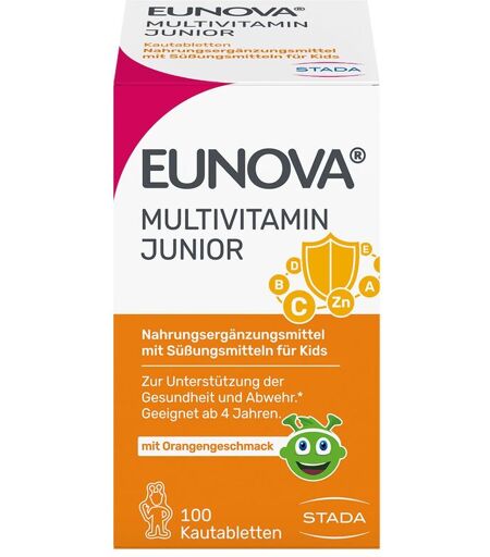 EUNOVA® JUNIOR KAUTABLETTEN MULTIVITAMINE FÜR KIDSKinder können fast unermüdlich sein und den ganzen Tag Spielen, Rennen und Toben. Ein stabiles Immunsystem und starke Abwehrkräfte ermöglichen es Ihnen, gesund und voller Energie zu bleiben.EUNOVA® Junior Kautabletten versorgen Kinder ab 4 Jahren mit 12 Vitaminen und wichtigen Mineralstoffen. Die lecker nach Orange schmeckenden Kautabletten sind frei von künstlichen Farb- und Konservierungsstoffen. PRODUKTPROFIL Multivitaminkomplex für Kids ab 4 Jahren Mit 12 Vitaminen und wichtigen Mineralstoffen Kautabletten mit leckerem Orangengeschmack Frei von Farb- und Konservierungsstoffen sowie ZuckerEUNOVA® JUNIOR KAUTABLETTEN ENTHALTEN VIELE WESENTLICHEN VITAMINE UND MINERALSTOFFE Erschöpfung und Müdigkeit können durch die Vitamine C, B2, B3, B5 und B6 und Folsäure verringert werden. Jod und Biotin (Vitamin B7) tragen zu einem normalen Energiestoffwechsel bei. Zink sowie die Vitamine C, D3 und A tragen zu einer normalen Funktion des Immunsystems bei. ANWENDUNGSEMPFEHLUNG Kinder ab 4 Jahren lassen täglich eine Tablette nach einer Mahlzeit im Mund zergehen.Nahrungsergänzungsmittel sind kein Ersatz für eine ausgewogene und abwechslungsreiche Ernährung und eine gesunde LebensweiseHÄUFIGE FRAGEN & ANTWORTENKönnen auch Erwachsene Eunova® Junior Kautabletten einnehmen? JaWie lange sind Eunova® Junior Kautabletten haltbar? Nach Anbruch sollten die Kautabletten innerhalb von 2 Monaten verbraucht werden.Dürfen Schwangere Eunova® Junior Sirup einnehmen? Schwangere Frauen sollten aufgrund des Vitamin-A-Gehaltes vor Beginn des Verzehrs ihren Arzt befragen. Auf die Einnahme weiterer zinkhaltiger Nahrungsergänzungsmittel ist zu verzichten.Zutaten: Süßungsmittel Sorbit, Xylit und Sucralose; L-Ascorbinsäure, Nicotinamid, färbendes Lebensmittel (Saflorkonzentrat), Trennmittel Speisefettsäuren, D-alpha-Tocopherolacetat, Trennmittel Magnesiumsalze der Speisefettsäuren, Zinkcitrat, Hefe-Beta-Glucan (Saccharomyces cerevisiae), Hagebuttenpulver, Farbstoff Anthocyane, Calcium-D-pantothenat, Säureregulator Äpfelsäure, Retinylacetat, Pyridoxinhydrochlorid, D-Biotin, Riboflavin, Thiaminmononitrat, Aroma, Cholecalciferol, Cyanocobalamin, Pteroylmonoglutaminsäure, KaliumjodidVerzehrempfehlung:Kinder ab 4 Jahren lassen täglich eine Tablette nach einer Mahlzeit im Mund zergehen.Hinweis:Die angegebene empfohlene Tagesmenge darf nicht überschritten werden.Aufbewahrung: Kühl (6-25 °C) und lichtgeschützt lagern. Außerhalb der Reichweite von kleinen Kindern aufbewahren.Nettofüllmenge: 100 St. Hersteller: STADA Arzneimittel AGStadastraße 2-1861118 Bad Vilbel ...