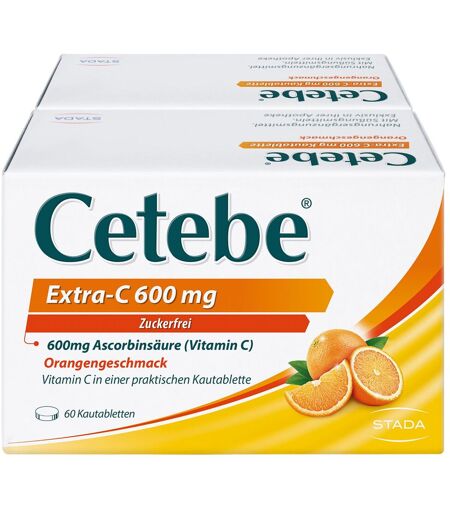 Nahrungsergänzungsmittel sind kein Ersatz für eine abwechslungsreiche und ausgewogene Ernährung und gesunde LebensweiseEXTRA-HOCHDOSIERT! VON DER NR. 1 VITAMIN C MARKE* Cetebe® Extra-C 600 mg unterstützt das Immunsystem: Zum Ausgleich bei erhöhtem Vitaminbedarf des Körpers, z. B. bei sportlichen Aktivitäten und kann die eigenen Abwehrkräfte unterstützen.Vitamin C ist für eine Vielzahl von physiologischen Funktionen wichtig. Unser Körper benötigt eine ständige Versorgung mit Vitamin C, da er es nicht selbst herstellen kann. Neben der normalen Funktion des Immunsystems unterstützt Vitamin C die Erhaltung der normalen Funktion von Knochen, Zähnen, Knorpeln, Zahnfleisch und Haut, da es zur Bildung von Kollagen beiträgt. Darüber hinaus ist Vitamin C ein Antioxidans, das die Zellen vor oxidativem Stress schützt und zur Verringerung von Müdigkeit und Ermüdung beiträgt. Cetebe® Extra-C 600 mg Kautabletten mit Orangengeschmack enthalten 600 mg Vitamin C und können ganz einfach ohne Flüssigkeit eingenommen werden.GUT ZU WISSEN: Hochdosierte Tabletten: Der Körper kann Vitamin C nicht selbst produzieren, sondern muss es über die Nahrung aufnehmen Unterstützung für das Immunsystem: Zum Ausgleich bei erhöhtem Vitaminbedarf des Körpers, z. B. bei sportlichen Aktivitäten - kann die eigenen Abwehrkräfte unterstützen. Einfache Anwendung: Erwachsene nehmen täglich 1 Tablette ein - die praktische Kautablette kann auch gut unterwegs und ohne eine Zugabe von Wasser eingenommen werden Als zuverlässiger und vertrauenswürdiger Partner unterstützt STADA seit mehr als 125 Jahren Gesundheit und Wohlbefinden. HÄUFIGE FRAGEN & ANTWORTEN: Wie setzt sich Cetebe® Extra-C 600 mg zusammen? Eine Kautablette Cetebe® Extra-C 600 mg enthält 600 mg Vitamin C.Was gibt es bei der Einnahme von Cetebe® Extra-C 600 mg zu beachten? Die angegebene empfohlene tägliche Verzehrmenge der Kautabletten mit Vitamin C darf nicht überschritten werden. Kann bei übermäßigem Verzehr abführend wirken. Nahrungsergänzungsmittel sind kein Ersatz für eine ausgewogene und abwechslungsreiche Ernährung und eine gesunde Lebensweise. Die Kautabletten mit Vitamin C von Cetebe® sind nicht für Kinder geeignet. Enthält eine Phenylalaninquelle. Nicht für Phenylketonuriker geeignet.ZutatenNatrium-L-Ascorbat, L-Ascorbinsäure, Sorbit, Aspartam, Acesulfam K, Neohesperidin DC, Natriumsaccharin; Speisefettsäuren, Magnesiumsalze der Speisefettsäuren, Talkum, Cellulose; Hydroxypropylmethylcellulose, Hydroxypropylcellulose; Orangenaroma, , Paprikaextrakt; Äpfelsäure; mittelkettige Triglyceride.Nährwerte: Durchschnittliche Nährwerte: pro 1 Tablette pro 100 g NRV* Vitamin C 600 mg 65.000 mg 750 * = Nährstoffbezugswerte gemäß Lebensmittelinformationsverordnung.Verzehrempfehlung:Nehmen Sie 1x täglich eine Kautablette einHinweis:Die empfohlene tägliche Verzehrmenge sollte nicht überschritten werden.Aufbewahrung: Kühl (6-25 °C) und lichtgeschützt lagern. Außerhalb der Reichweite von kleinen Kindern aufbewahren.Nettofüllmenge: 30... ...