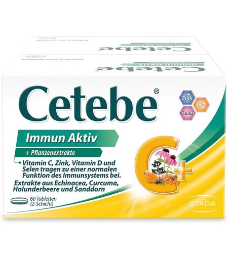 Nahrungsergänzungsmittel sind kein Ersatz für eine abwechslungsreiche und ausgewogene Ernährung und eine gesunde Lebensweise. CETEBE® IMMUN AKTIV – 8-FACH UNTERSTÜTZUNG FÜR IHRE ABWEHRKRÄFTE Ob in der Erkältungszeit, bei Stress oder starker körperlicher Belastung – es gibt Zeiten, in denen Ihre Abwehrkräfte besonders gefordert sind. Unser Immunsystem ist entscheidend für unsere Gesundheit, denn es schützt uns vor Infekten. Cetebe® Immun Aktiv unterstützt besonders in diesen Zeiten Ihre Abwehrkräfte durch die wertvolle Kombination aus essenziellen Vitaminen und Mineralstoffen (Vitamin C, D3, Zink und Selen) sowie ausgesuchten Pflanzenextrakten aus Echinacea, Curcuma, Holunderbeere und Sanddorn. GUTES AUS 2 WELTEN: IMMUN-INHALTSSTOFFE KOMBINIERT MIT AUSGESUCHTEN PFLANZENEXTRAKTEN Nahrungsergänzungsmittel zur Unterstützung der Abwehrkräfte durch Vitamin C, D3, Zink und Selen sowie Pflanzenextrakten aus Curcuma, Echinacea, Sanddorn und Holunderbeere Vitamin C unterstützt das Immunsystem Vitamin D trägt zur Erhaltung normaler Knochen und Muskelfunktionen bei Zink trägt zur Erhaltung normaler Haut, Haare und Nägel bei Selen trägt dazu bei, die Zellen vor oxidativem Stress zu schützen Geeignet für Erwachsene HÄUFIGE FRAGEN & ANTWORTEN Wer sollte verstärkt auf eine ausreichende Zufuhr an Vitamin C, Zink, Vitamin D und Selen achten? Natürlich sollte jeder von uns jeden Tag darauf achten, ausreichend mit Vitamin C, Zink, Vitamin D und Selen versorgt zu sein, denn eine einseitige Ernährung und ein ungesunder Lebensstil können zu einer Nährstoffunterversorgung führen. Darüber hinaus ist besonders bei seltenem Kontakt mit Sonnenlicht, z.B. wenn die Tage kürzer werden, darauf zu achten, Vitamin D ausreichend über die Nahrung aufzunehmen. Zudem gibt es einige Personengruppen, die besonders auf eine ausreichende Versorgung mit Vitaminen und Mineralstoffen achten sollten, da man bei ihnen von einem erhöhten Bedarf bzw. einer zu niedrigen Aufnahme/Eigensynthese ausgeht. Dazu können u.a. gehören: Senioren, Personen mit starker körperlicher und psychischer Belastung (z.B. durch anhaltenden Stress und/oder Sport), Raucher, Vegetarier, Veganer und Personen, die sich wenig draußen aufhalten. Welche Bedeutung haben Vitamin C, Zink, Vitamin D und Selen für das Immunsystem? Cetebe® Immun Aktiv liefert mit Vitamin C, Zink, Vitamin D und Selen gleich 4 wichtige Nährstoffe, die jeweils die Körperabwehr unterstützen und so zu einer normalen Funktion des Immunsystems beitragen. Ist Cetebe® Immun Aktiv für Vegetarier geeignet? Cetebe® Immun Aktiv ist für Vegetarier geeignet. Außerdem ist das Nahrungsergänzungsmittel glutenfrei, frei von Konservierungsstoffen, künstlichen Farbstoffen, Soja, Milcheiweiß und Laktose. Wie lange ist Cetebe® Immun Aktiv haltbar? Nach Anbruch der Packung ist Cetebe® Immun Aktiv innerhalb von 4 Monaten zu verbrauchen. An einem dunklen und trockenen Ort bei unter 25 °C aufbewahren. Zutaten: Vitamin C (als L-Ascorbinsäure),... ...