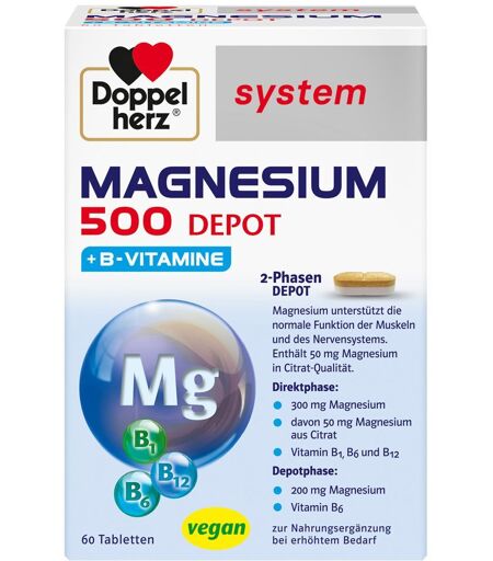 Nahrungsergänzungsmittel sind kein Ersatz eine abwechslungsreiche und ausgewogene Ernährung und gesunde Lebensweise.Doppelherz® system Magnesium 500 Depot Tabletten mit 2-Phasen Depot - Direktphase und Depotphase Magnesium für die normale Funktion der Muskeln und des Nervensystems Plus Vitamin B1, B6 und B12 Bei erhöhtem BedarfMagnesium ist ein lebensnotwendiger Mineralstoff, den der Körper nicht selbst bilden kann. Eine Speicherung ist nur in begrenztem Umfang möglich.Durch eine starke körperliche Belastung in Beruf oder Sport, einen erhöhten Schweißverlust oder eine unausgewogene Ernährung kann ein erhöhter Bedarf an Magnesium entstehen. Die Magnesium 500 DEPOT Tabletten von Doppelherz system führen dem Körper über viele Stunden des Tages Magnesium für eine normale Funktion der Muskeln und des Nervensystems zu: Die Direktphase liefert 300 mg Magnesium mit einem Citratanteil von 50 mg in Kombination mit 2,5 mg Vitamin B6. Die Depotphase liefert 200 mg Magnesium zusammen mit 2,5 mg Vitamin B6. Was bietet das 2-Phasen Depot?Das 2-Phasen Depot von Doppelherz system besteht aufgrund eines speziell entwickelten Herstellungsverfahrens aus zwei unterschiedlichen Tablettenschichten. Es arbeitet nach dem Prinzip der schnellen Nährstofffreigabe und Langzeit-Nährstofffreigabe.Das Prinzip von Direktphase und DepotphaseIn der Depotphase“ wird das enthaltene Magnesium über viele Stunden nach und nach freigegeben und dem Körper so anhaltend durch kleinere Portionen“ über den Tag verteilt zur Verfügung gestellt. Dagegen wird das Magnesium der Direktphase“ zügiger freigegeben. Es steht dem Körper so schneller zur Verfügung. Magnesium unterstützt den normalen Energiestoffwechsel sowie die normale Funktion des Nervensystems. Der Mineralstoff leistet einen Beitrag zum Elektrolytausgleich und zur normalen Muskelfunktion. Vitamin B6 leistet einen Beitrag zum normalen Eiweiß- und Glykogenstoffwechsel und spielt für die normale Funktion des Nervensystems eine Rolle.NahrungsergänzungsmittelTabletten mit Magnesium und Vitamin B1, B6 und B12Zutaten: Magnesiumoxid, Magnesiumsalze der Citronensäure, Füllstoff mikrokristalline Cellulose, Füllstoff Isomalt, Füllstoff Dicalciumphosphat, Füllstoff Hydroxypropylmethylcellulose, modifizierte Stärke, Trennmittel vernetzte Natriumcarboxymethylcellulose, Füllstoff Polyvinylpyrrolidon, Trennmittel Speisefettsäuren, Überzugsmittel Hydroxypropylcellulose, Trennmittel Magnesiumsalze der Speisefettsäuren, Farbstoff Eisenoxide und Eisenhydroxide, Pyridoxinhydrochlorid, Trennmittel Talkum, Thiaminhydrochlorid, Trennmittel Siliciumdioxid, Kokosöl, CyanocobalaminNährwerte: Zusammensetzung pro ½ Tablette % NRV* pro Tagesportion (=1 Tablette) % NRV* Magnesium 250 mg 66,5 % 500 mg 133 % Vitamin B1 1,1 mg 100 % 2,2 mg 200 % Vitamin B6 2,5 mg 178,5 % 5 mg 357 % Vitamin B12 2,5 µg 100 % 5 µg 200 % * Nährstoffbezugswerte gemäß EU-Verordnung 1169/2011Verzehrempfehlung:Täglich 1/2 - 1 Tablette zu einer Mahlzeit mit ausreichend Flüssigkeit unzerkaut... ...