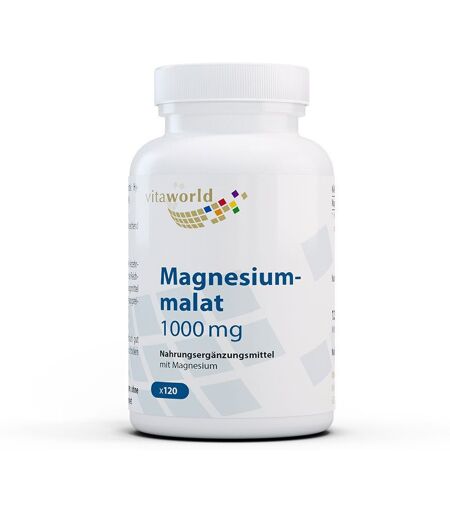 Nahrungsergänzungsmittel sind kein Ersatz für eine ausgewogene und abwechslungsreiche Ernährung und eine gesunde Lebensweise.Magnesiummalat 1000 mg Für mehr Energie – Magnesiummalat Magnesium ist einer der lebenswichtigen Mineralstoffe, die der Körper nicht selbst herstellen kann und über die Nahrung zugeführt werden muss. Das Mineral ist für viele Prozesse im Körper existenziell, darunter in erster Linie für den Energiestoffwechsel, für vitale Muskelfunktionen sowie für wichtige biochemische Vorgänge innerhalb der Muskeln und Nerven. Wenn dem Körper zu wenig Magnesium zur Verfügung steht, werden die Membranen durchlässiger für Natrium, Kalium und Calcium, wodurch die Erregbarkeit der Nervenzellen steigt und damit auch die Neigung zu Muskelkrämpfen. Magnesium stabilisiert die Zellmembranen, senkt die Erregbarkeit der Nervenzellen und trägt damit zu einer normalen Muskelfunktion bei. Bei einer Unterversorgung mit Magnesium greift der Körper auf das Magnesium in den Knochen oder Körperzellen zurück, um einen konstanten Magnesiumspiegel im Blut sicherzustellen. Ein Magnesiummangel hätte daher auch negative Folgen für ansonsten vitale Knochen.Der tägliche Bedarf an Magnesium liegt für Erwachsene bei ca. 300 bis 400 mg, bei schwangeren und stillenden Frauen etwas höher. Faktoren wie starkes Schwitzen bei sportlicher Betätigung oder eine zu geringe Flüssigkeitszufuhr können zudem zu einem erhöhten Magnesiumbedarf führen. Bei Magnesiummalat handelt es sich um die organische Verbindung von Magnesium mit den Salzen der Äpfelsäure (Malat). Magnesiummalat kann sehr gut vom Körper aufgenommen werden und ist gut verträglich. Äpfelsäure spielt eine wichtige Rolle bei der ATP-Synthese und somit der Energieproduktion in unseren Zellen.Zutaten:89 % Magnesiummalat, Überzugsmittel: Hydroxypropylmethylcellulose (pflanzliche Kapselhülle)Nährwerte: Durschnittliche Nährwerte: 2 Kapseln NRV% Magnesium 300 mg 80% Verzehrempfehlung:Täglich 2 Kapseln mit ausreichend Wasser verzehren.Hinweis:Die angegebene empfohlene tägliche Verzehrmenge darf nicht überschritten werden.Aufbewahrung:Kühl (6-25 °C) und lichtgeschützt lagern. Außerhalb der Reichweite von Kindern aufbewahren.Die Dose nach Gebrauch gut verschlossen halten.Nettofüllmenge: 120 KapselnHerstellerdaten: Vita-World GmbH Röderweg 26 65232 Taunusstein Deutschland ...