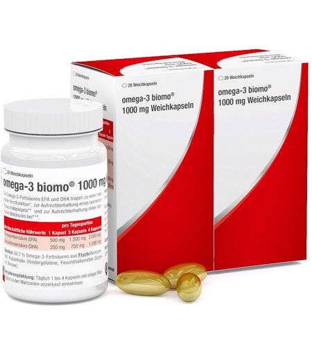 Nahrungsergänzungsmittel sind kein Ersatz für eine ausgewogene und abwechslungsreiche Ernährung und eine gesunde Lebensweise.omega-3 biomo® 1000 mg WeichkapselnDie Omega-3-Fettsäuren EPA und DHA von EPAX, einer der ersten und jetzt führenden Hersteller von marin-basiertem Fischöl, zeichnen sich aufgrund ihrer innovativen technisch hochwertigen Reinigungsprozesse und somit durch ihre besondere Reinheit aus. Die besondere EPAX Qualität ist durch über 100 Studien belegt. Die Omega-3-Fettsäuren EPA und DHA sind lebenswichtig und ein wichtiger Bestandteil einer gesunden Ernährung. Leider ist die Versorgung mit diesen lebenswichtigen, langkettigen, mehrfach ungesättigten Fettsäuren nicht bei allen Menschen optimal. Wer sich gesund ernähren möchte, sollte insbesondere mit fortschreitendem Alter zum Erhalt einer normalen Herzfunktion, eines normaler Blutfettspiegels und zur Aufrechterhaltung eines normalen Blutdrucks auf eine ausreichende Zufuhr an Omega-3-Fettsäuren achten. Die Omega-3-Fettsäuren EPA und DHA tragen zu einer normalen Herzfunktion (die positive Wirkung stellt sich bei einer täglichen Aufnahme von 250 mg EPA und DHA ein, entspricht 1 Kapsel pro Tag), zur Aufrechterhaltung eines normalen Triglyceridspiegels (die positive Wirkung stellt sich bei einer täglichen Aufnahme von 2 g EPA und DHA ein, entsprechend 3 Kapseln pro Tag) und zur Aufrechterhaltung eines normalen Blutdrucks (die positive Wirkung stellt sich bei einer täglichen Aufnahme von 3 g EPA und DHA ein, entsprechend 4 Kapseln pro Tag) bei.Zutaten:60,7 % Omega-3-Fettsäuren aus Fischölkonzentrat, Kapselhülle (Rindergelatine, Feuchthaltemittel Glycerin, Wasser). Laktosefrei Glutenfrei Nährwerte: Durschnittliche Nährwerte: pro 1 Kapsel pro 3 Kapseln pro 4 Kapseln Omega-3-Fettsäuren-haltiges Fischölkonzentrat 1.000 mg 3.000 mg 4.000 mg Omega-3-Fettsäuren insgesamt 830 mg 2.490 mg 3.320 mg -davon Eicosapentaensäure (EPA) 500 mg 1.500 mg 2.000 mg -davon Docosahexaensäure (DHA) 250 mg 750 mg 1.000 mg Verzehrempfehlung: Täglich 1 bis 4 Kapseln mit etwas Flüssigkeit zu den Mahlzeiten unzerkaut einnehmen.Hinweis:Die angegebene empfohlene tägliche Verzehrmenge darf nicht überschritten werden.Aufbewahrung: Kühl (6-25 °C) und lichtgeschützt lagern. Außerhalb der Reichweite von Kindern aufbewahren.Nettofüllmenge: 56 WeichkapselnHerstellerdaten: biomo® pharma GmbH Josef-Dietzgen-Str. 3 53773 Hennef ...