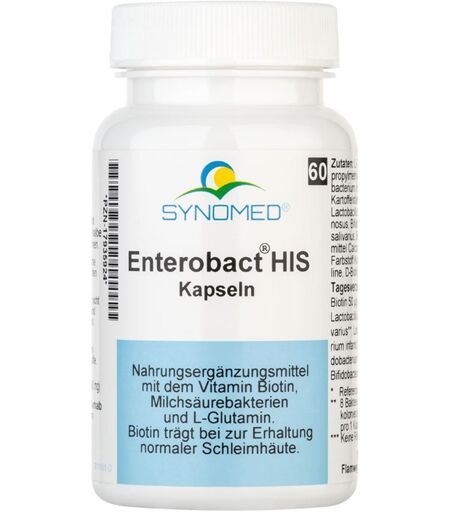 Nahrungsergänzungsmittel sind kein Ersatz für eine abwechslungsreiche und ausgewogene Ernährung und eine gesunde Lebensweise.SYNOMED® Enterobact® HISNahrungsergänzungsmittel mit dem Vitamin Biotin, Milchsäurebakterien und L-Glutamin. Biotin trägt bei zur Erhaltung normaler Schleimhäute.Zutaten:L-Glutamin, Reisstärke, Hydroxypropylmethylcellulose (Kapselhülle), Bifidobacterium infantis, Bifidobacterium longum, Kartoffelstärke, Bifidobacterium bifidum, Lactobacillus gasseri, Lactobacillus rhamnosus, Bifidobacterium breve, Lactobacillus salivarius, Bifidabacterium lactis, Trennmittel Calciumsalze der Speisefettsäuren, Farbstoff Kupferkomplexe der Chlorophylline, D-Biotin.Nährwerte: Durchschnittliche Nährwerte: pro Tagesverzehrempfehlung (1 Kapsel): Biotin 50 µg (100%) L-Glutamin 200 mg (***) Lactobacillus rhamnosus** Lactobacillus salivarius** Lactobacillus gasseri** Bifidobacterium infantis**Bifidobacterium longum**Bifidobacterium breve**Bifidobacterium bifidum**Bifidobacterium lactis** - * Referenzmenge nach LMIV (NRV) ** 8 Bakterienkulturen mit insgesamt 1,0 x 1010 kolonienbildende Einheiten (KBE) pro 1 Kapsel.*** Keine Referenzmenge nach LMIV bekannt.Verzehrempfehlung:Täglich 1 Kapsel mit ausreichend Flüssigkeit optimalerweise eine halbe Stunde vor der Mahlzeit verzehren.Hinweis:Die angegebene empfohlene Tagesmenge darf nicht überschritten werden.Aufbewahrung: Kühl (6-25 °C) und lichtgeschützt lagern. Außerhalb der Reichweite von kleinen Kindern aufbewahren.Nettofüllmenge: 30 Kapseln 60 Kapseln Herstellerdaten: Synomed GmbH Flamweg 134 25335 Elmshorn Deutschland ...