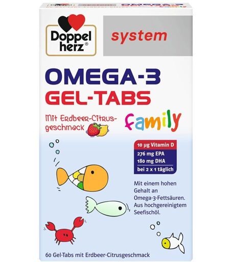 Nahrungsergänzungsmittel sind kein Ersatz für eine ausgewogene und abwechslungsreiche Ernährung und eine gesunde Lebensweise.Doppelherz® system OMEGA-3 GEL-TABS familyWas ist das Besondere an den Doppelherz system OMEGA-3 family Gel-Tabs Erdbeer-Citrus? Dank einer neuen Herstellungstechnologie bietet Doppelherz system OMEGA-3 family Gel-Tabs Erdbeer-Citrus einen hohen Gehalt der wertvollen Omega-3-Fettsäuren EPA und DHA kombiniert mit Vitamin Din Form von fruchtig schmeckenden Gel-Tabs. Diese Darreichungsform ist für Kinder, Jugendliche und Erwachsene, also für die ganze Familie gut geeignet. Doppelherz system OMEGA-3 family Gel-Tabs sind Weichtabletten zum Kauen mit leckerem Erbeer-Citrusgeschmack. Sie enthalten Omega-3-Fettsäuren aus hochgereinigten Seefischölen und Vitamin D.Zutaten:Omega-3-Fettsäuren-haltiges Konzentrat aus SEEFISCHÖLEN, Süßungsmittel Xylit, Wasser, Süßungsmittel Sorbit, Gelatine (Rind), Säureregulator Trinatriumcitrat, natürliches Aroma, Säureregulator Citronensäure, Antioxidationsmittel Ascorbinsäure, Farbstoff Paprikaextrakt, CholecalciferolNährwertangaben: Zusammensetzung pro 1 Weichtablette % NRV* pro 2 Weichtabletten % NRV* Seefischöl 480 mg ** 960 mg ** - darin Eicosapentaensäure (EPA) 138 mg ** 276 mg ** - darin Docosahexaensäure (DHA) 90 mg ** 180 mg ** Omega-3-Fettsäuren insgesamt 270 mg ** 540 mg ** Vitamin D 5 μg 100 % 10 μg 00 % * Nährstoffbezugswerte gemäß EU-Verordnung 1169/2011** keine Nährstoffbezugswerte vorhanden Verzehrempfehlung:Kinder von 4-5 Jahren kauen täglich 1 Weichtablette. Kinder ab 6 Jahren, Jugendliche und Erwachsene kauen bei einer Omega-3-Fettsäuren-armen Ernährung täglich 2 Weichtabletten. Hinweise: Die angegebene empfohlene Tagesmenge darf nicht überschritten werden. Kann bei übermäßigem Verzehr abführend wirken. Aufbewahrung:Kühl (6-25 °C) und lichtgeschützt lagern. Außerhalb der Reichweite von kleinen Kindern aufbewahren. Nettofüllmenge: 60 St.Herstellerdaten: Queisser Pharma GmbH & Co. KG Schleswiger Str. 74 24941 Flensburg ...