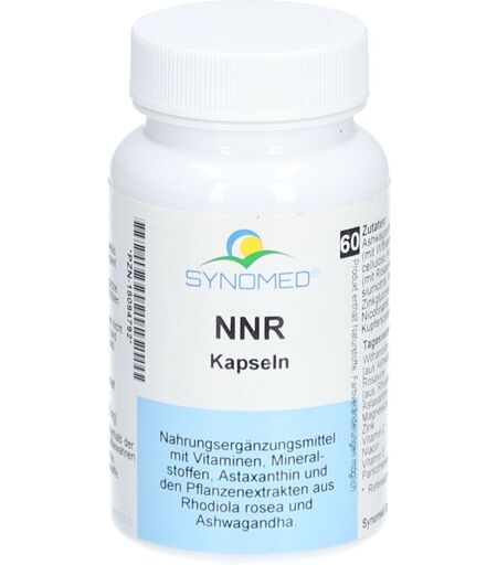 Nahrungsergänzungsmittel sind kein Ersatz für eine ausgewogene und abwechslungsreiche Ernährung und eine gesunde Lebensweise.Synomed NNR KapselnNNR Kapseln von Synomed sind ein Nahrungsergänzungsmittel, das eine besondere Kombination aus Vitaminen, Mineralstoffen, der Aminosäure L-Phenylalanin sowie wertvollen Pflanzenstoffen wie Ashwagandha-Extrakt und Rhodiola rosea enthält. Diese Inhaltsstoffe können zur Unterstützung eines gesunden Hormon- und Neurotransmitterstoffwechsels beitragen. Pantothensäure spielt dabei eine Rolle bei der Synthese von Steroidhormonen und der Produktion einiger Neurotransmitter. Die Kapseln sind vegan, glutenfrei und frei von Laktose sowie Hefe.Zutaten:Ashwagandha-Extrakt (Withania somnifera) mit Withanoliden, Rhodiola rosea-Extrakt mit Rosavinen, L-Phenylalanin, Calcium-L-ascorbat, Magnesiumcitrat und Magnesiumoxid, Zinkgluconat, D-α-Tocopherylsäuresuccinat (Vitamin E), Nicotinamid (Vitamin B3), Calcium-D-Pantothenat (Vitamin B5), Farbstoff Kupferkomplexe der Chlorophylline, Kapselhülle: HydroxypropylmethylcelluloseNährwertangaben: Withanolide7,5 mg Ashwagandha-Extrakt300 mg Rosavine3 mg Rhodiola rosea-Extrakt100 mg L-Phenylalanin- Astaxanthin2 mg Magnesium60 mg (16%) Zink5 mg (50%) Vitamin C80 mg (100%) Niacin16 mg NE (100%) Vitamin E18 mg α-TE (150%) Pantothensäure6 mg (100%) Verzehrsempfehlung:Täglich morgens und mittags je 1 Kapsel mit ausreichend Flüssigkeit einnehmen. Die empfohlene Tagesdosis sollte nicht überschritten werden.Aufbewahrungs- & Verwendungshinweis:Die angegebene empfohlene Verzehrempfehlung darf nicht überschritten werden. Nahrungsergänzungsmittel dürfen nicht als Ersatz für eine ausgewogene und abwechslungsreiche Ernährung verwendet werden. Außerhalb der Reichweite von kleinen Kindern bei Raumtemperatur lagern. Nettofüllmenge:60 KapslenHestellerdaten:Synomed GmbHFlamweg 13425335 Elmshorn ...