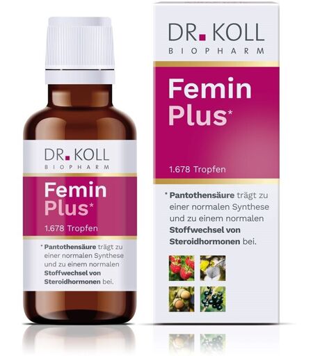 Nahrungsergänzungsmittel sind kein Ersatz für eine ausgewogene und abwechslungsreiche Ernährung und eine gesunde Lebensweise. Produktinformationen Femin Plus* Dr. Koll *Pantothensäure trägt zu einer normalen Synthese und zu einem normalen Stoffwechsel von Steroidhormonen, Vitamin D und einigen Neurotransmittern bei. *Niacin trägt zur Erhaltung normaler Haut bei.*Vitamin B6 und B12 tragen zur Verringerung von Müdigkeit und Ermüdung bei.Nahrungsergänzungsmittel mit Glycerolkomplettextrakten aus Sprossen der Himbeere, aus Knospen der Silberlinde, aus Knospen der Eiche, aus Knospen der schwarzen Johannisbeere, Pantothensäure, Niacin, VitaminenGlutenfrei. Lactosefrei. Ohne Gelatine. Vegan.Zutaten:Wasser, Glycerin, Ethanol, Glycerolkomplettextrakt aus Sprossen der Himbeere, Glycerolkomplettextrakt aus Knospen der Silberlinde, Glycerolkomplettextrakt aus Knospen der Eiche, Glycerolkomplettextrakt aus Knospen der schwarzen Johannisbeere, Calcium-D-pantothenat, Pyridoxinhydrochlorid, Nicotinamid, Methylcobalamin Nährwerte: Inhaltsstoffe pro Tagesdosis (60 Tropfen) % NRV* Pantothemsäure 3 mg 50 Niacin 0,88 mg 55 Vitamin B6 0,7 mg 50 Vitamin B12 2,5 µg 100 Glycerollkomplettextrakte aus: Sprossen der Himbeere 75,34 mg ** Knopsen der Silberlinde 75,34 mg ** Knospen der Eiche 22,60 mg ** Knospen der schwarzen Johannisbeere 15,06 mg ** *Nährwertbezugswerte gemäß VO (EU) Nr. 1169/2011 pro Tagesdosis** Keine NRV vorhandenVerzehrempfehlung:2 x 30 Tropfen täglich pur oder in Wasser verzehren. Vor Gebrauch schütteln. Hinweis:Die angegebene empfohlene Tagesmenge darf nicht überschritten werden.Aufbewahrung: Kühl (6-25 °C) und lichtgeschützt lagern. Außerhalb der Reichweite von kleinen Kindern aufbewahren. Nettofüllmenge:50 ml Hersteller: Dr. Koll Biopharm GmbHAm Johannisberg 68a-70 D-53474 Bad Neuenahr ...